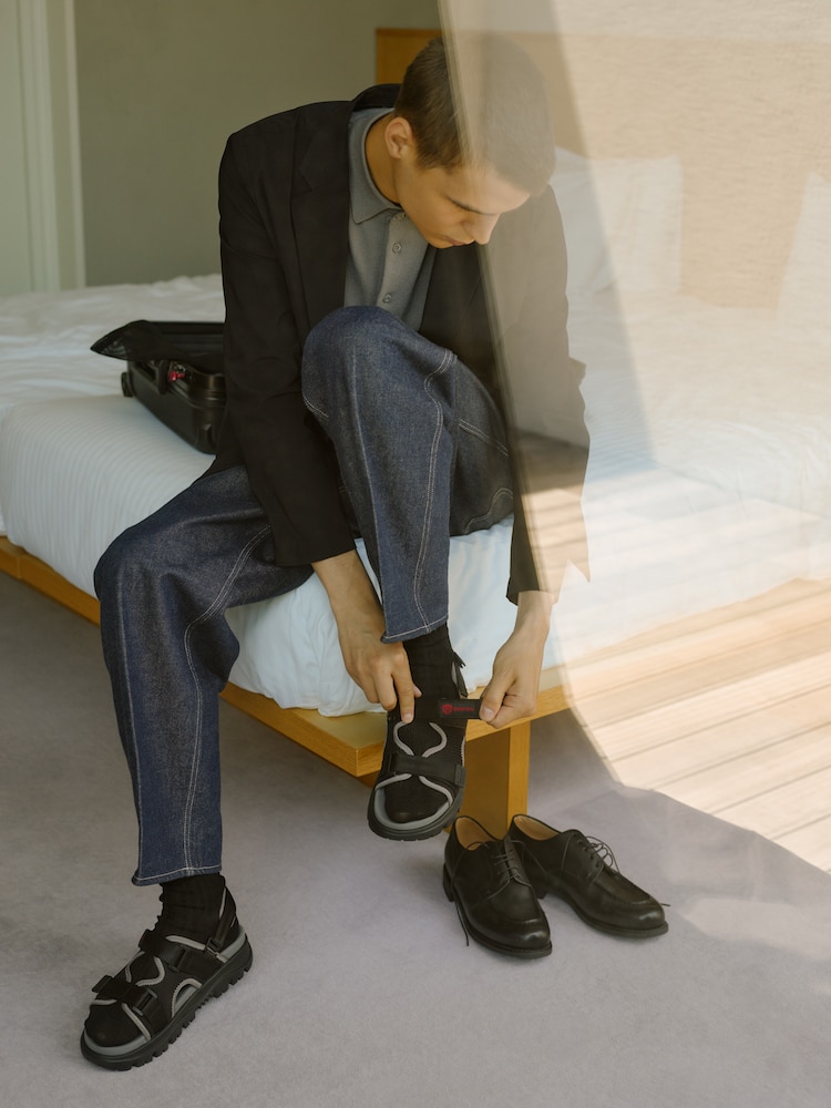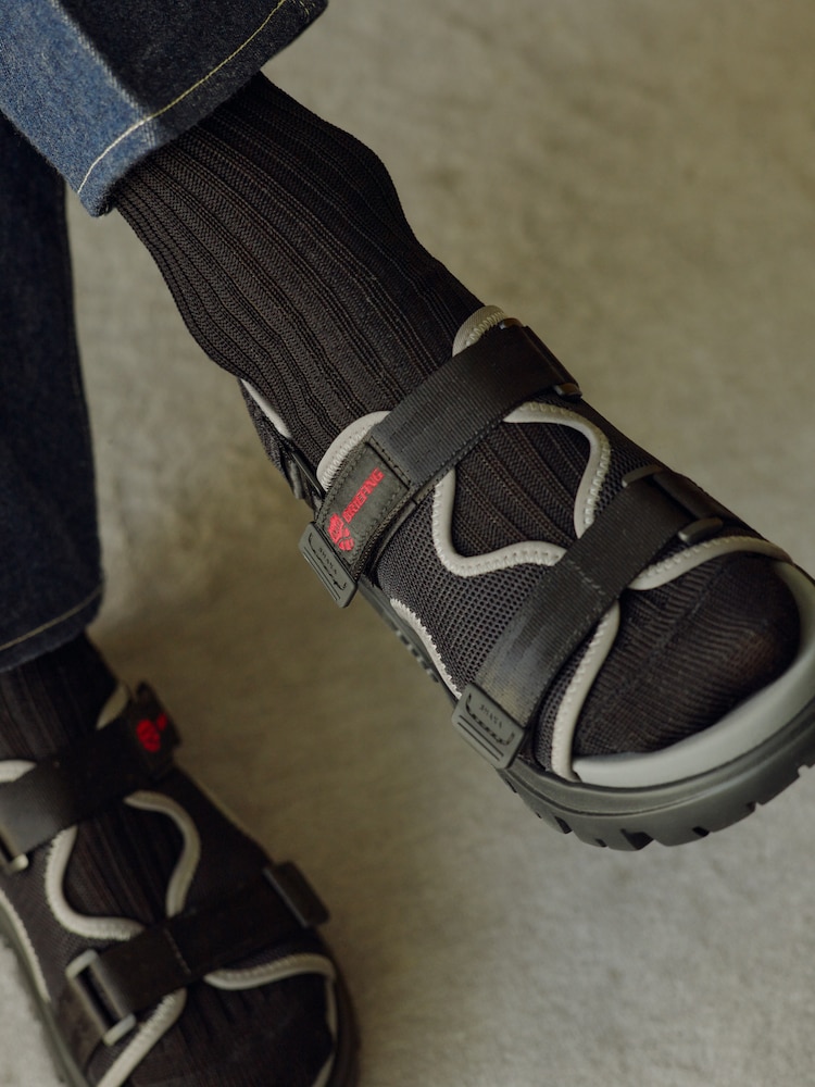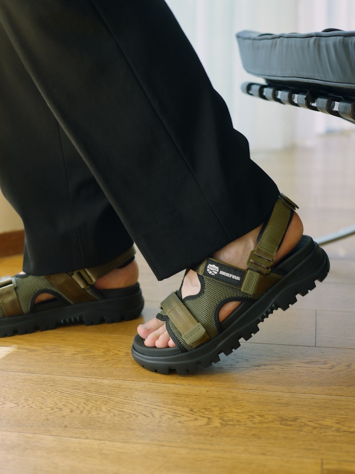 今回のコラボ第2弾で登場するのは、「街使いとアウトドアーユースの垣根をなくしたい」という両社の思いが込められたコラボレーションアイテム。BRIEFING のキーカラーを落とし込んだ計3色展開で、“BLACK×GRAY”、“BLACK×KHAKI”、“BEIGE”が登場します。カラーとリンクしたメッシュ仕様の特別ノベルティポーチも展開。ベースは、SHAKAで展開中のバタフライ上のアッパーデザインが特徴的なスポーツサンダル「CHILL OUT EX(チルアウト EX)」を元に設計。機能面では速乾性を向上させるため、ストラップ裏の素材をメッシュ仕様に施したアッパーや、長時間履いても疲れにくく、軽量かつグリップ性能と耐久性に優れた快適な歩行をサポートしてくれるEXソールを採用しています。