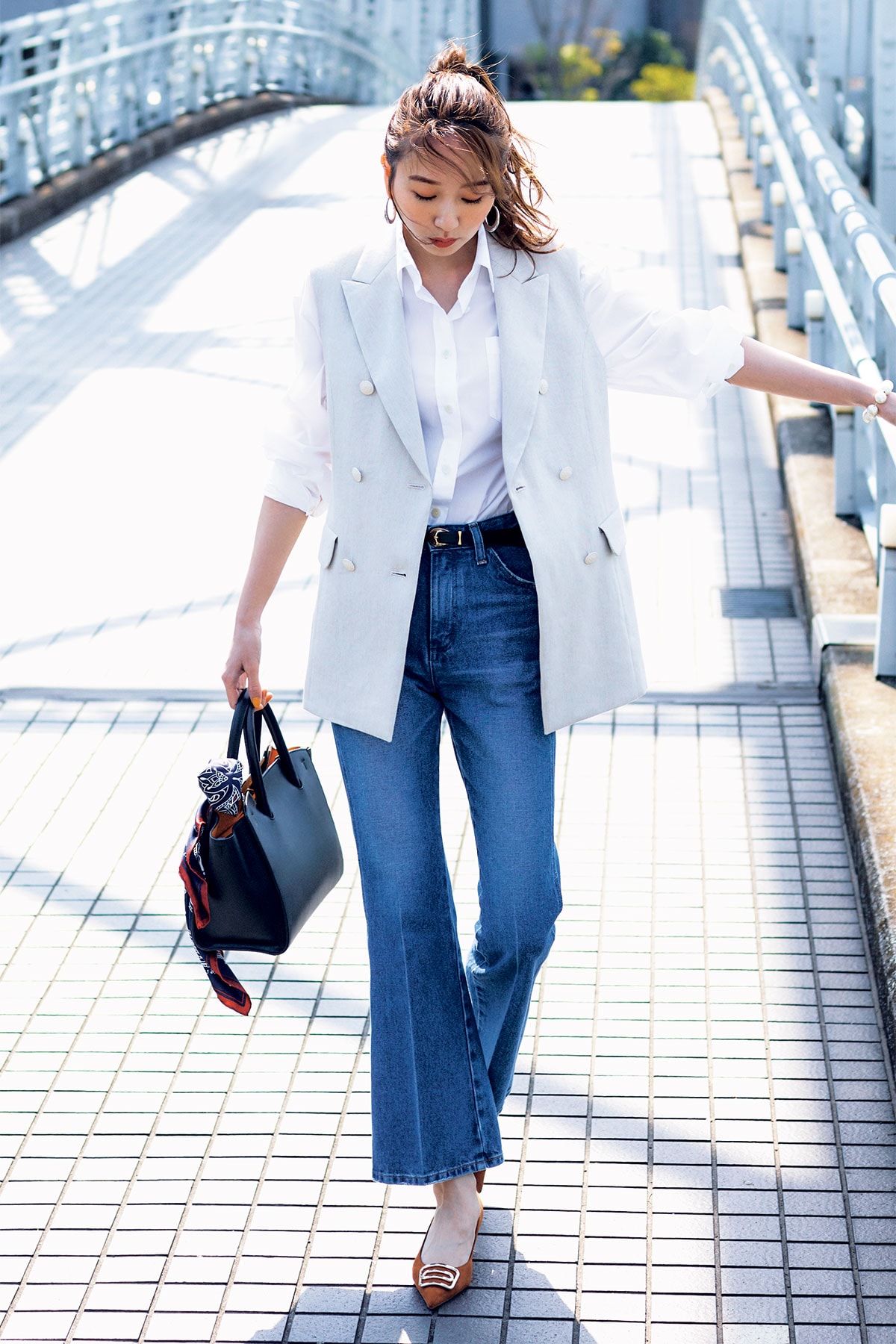 デニムOKの会社も増えているけれど、カジュアルすぎてオフィスで浮くのはNG。良識あるオシャレが問われる、腕の見せ所!すらっと見えるシルエットはそれだけでも上品な印象に。デニムパンツ¥15,950(Wrangler/エドウイン・カスタマーサービス)ジレ¥58,300(ANAYI)シャツ¥75,900(マリア マクマナス/ロンハーマン)ベルト¥9,350(レフィージェ/アルアバイル)バッグ¥90,200(FURLA/FURLA JAPAN)バッグにつけたスカーフ¥14,300(マニプリ)パンプス¥64,900(ペリーコ/アマン)ピアス¥5,250バングル¥5,880(ともにアビステ)