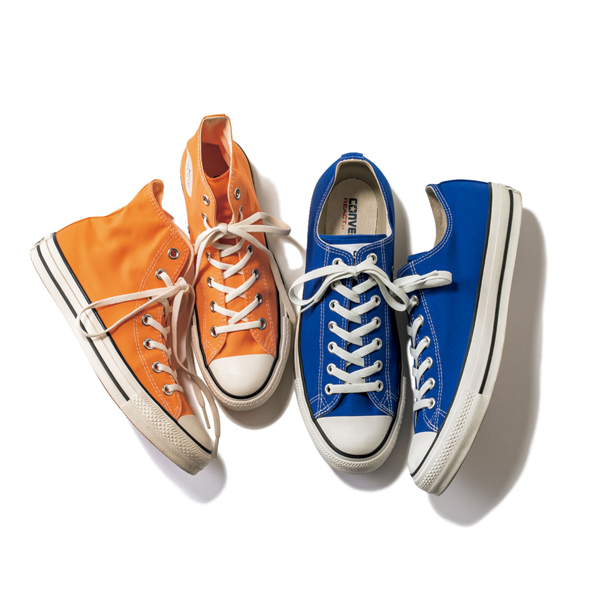 王道・オールスターはビビッドカラーでリンク、ハイカットとローカットの形違いで履くのが今っぽい。サンセットオレンジとコバルトブルーの鮮やかな色はこれからの季節にぴったり。