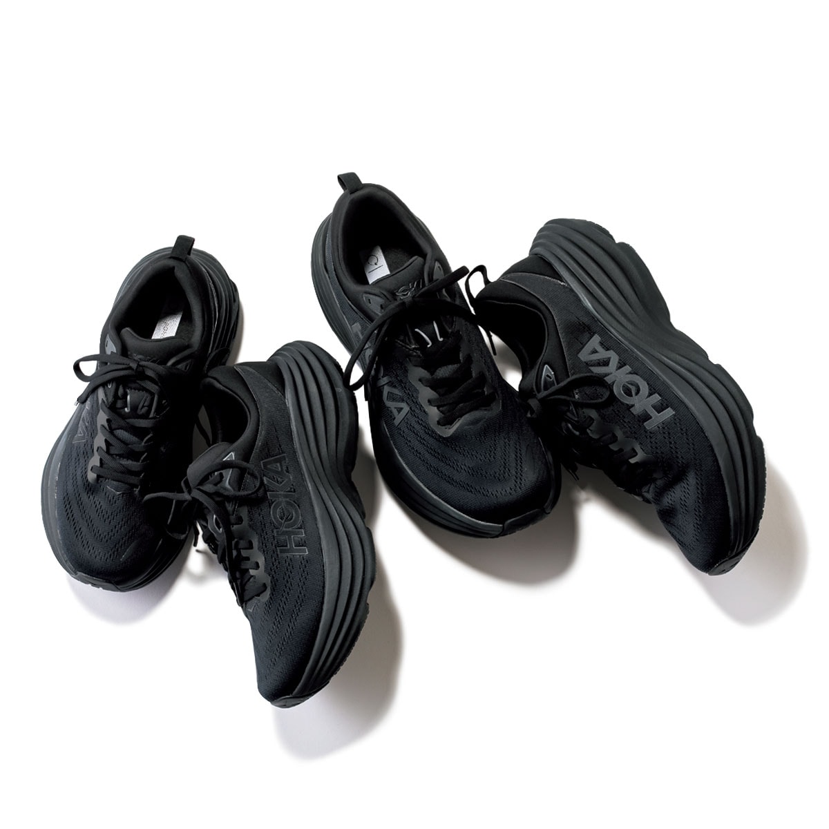 HOKA®のラインナップの中でも最上級のクッション性を誇るモデル「BONDI 8」。同じモデルでも〝お揃い感〟が控えめに感じられる〝オールブラック〟を。厚底で身長を盛れるところも高ポイント!〈左〉「BONDI 8」¥25,300〈右〉同¥25,300(ともにホカ®/デッカーズジャパン)