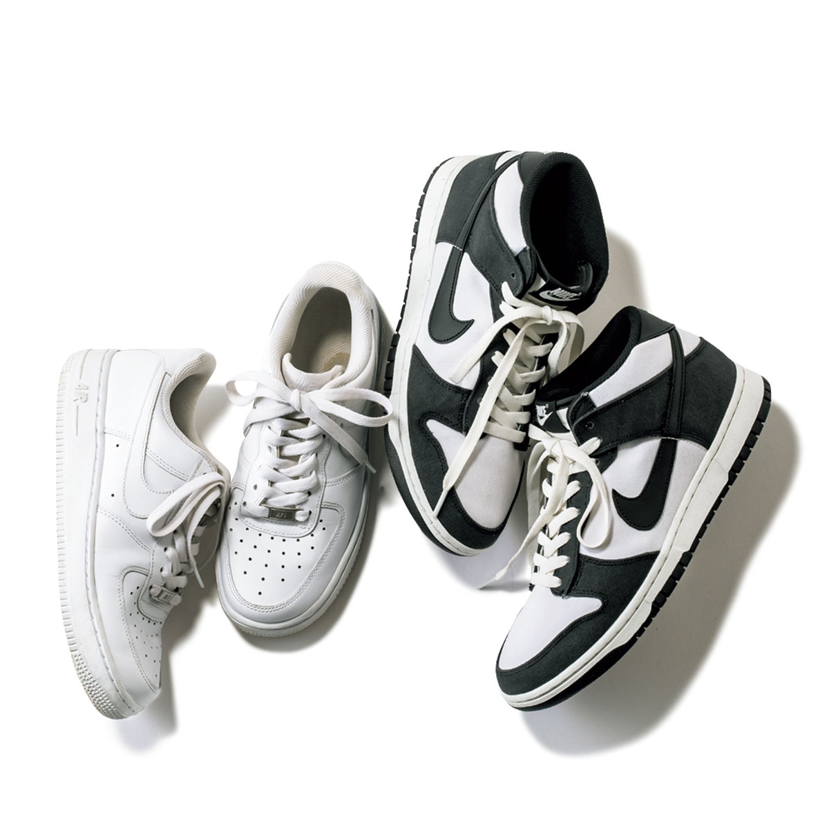 ナイキの定番モデル「エア フォース 1」「ダンク」は大人っぽぽい白黒カラーをセレクトして。ローテクとモノトノトーンでお揃い感を演出。〈左〉ナイキ エア フォース 1 ’07¥13,200〈右〉ナイキ ダンク ミミッド¥14,300(ともにナイキ/NIKE カスタママーサービス)