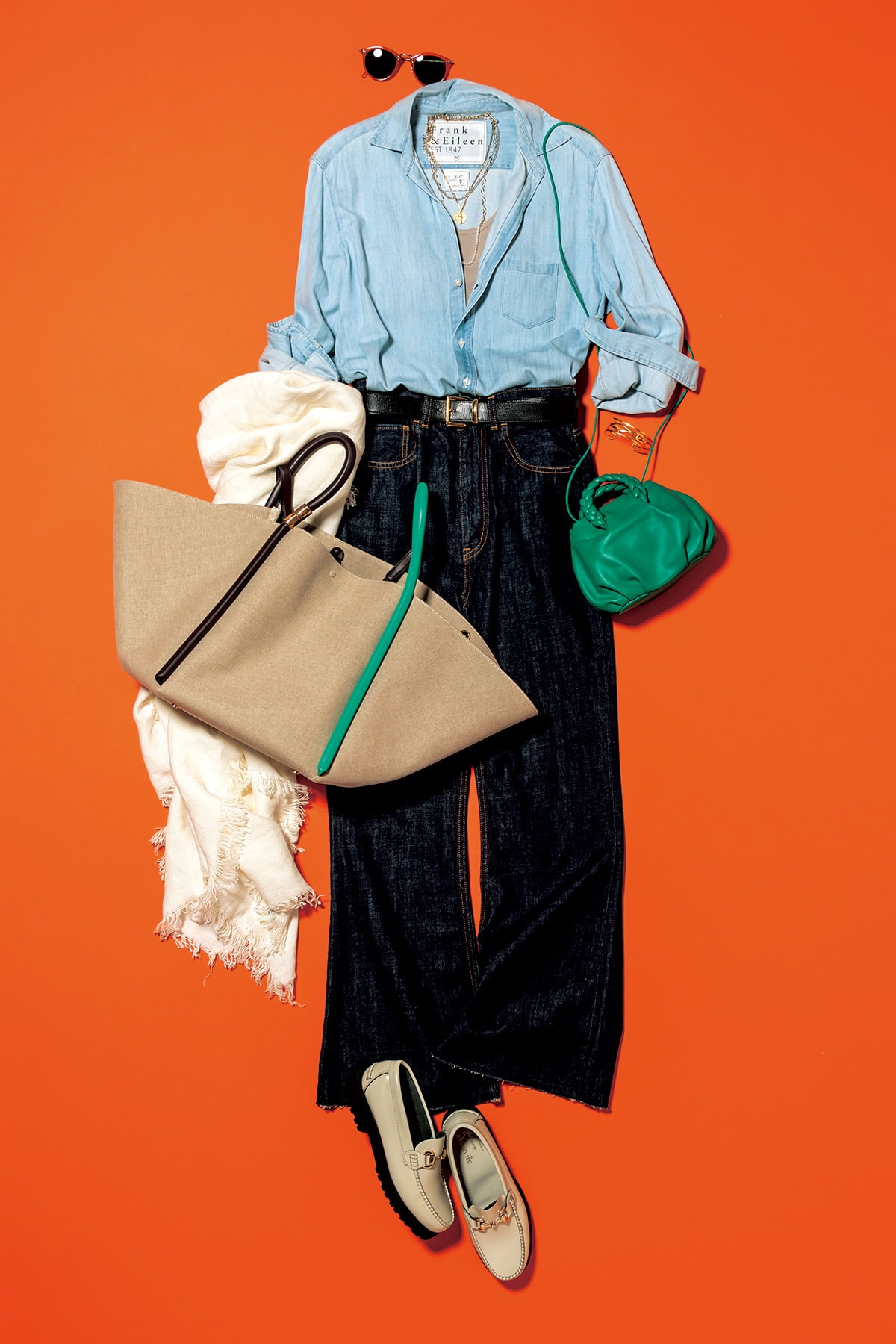 今年はこんな濃淡のあるデニムONデニムもあり!シャツ¥47,300(フランク&アイリーン/サザビーリーグ)タンクトップ¥8,800(マイカ アンド ディール/マイカ アンド ディール 恵比寿店)デニムパンツ¥31,900(RH ヴィンテージ/ロンハーマン)ショルダーバッグ¥50,600〈ヘリュー〉ベルト¥15,400〈アルアバイル〉ローファー¥25,300〈アルテサノス・ペル・アルアバイル〉(すべてアルアバイル)トートバッグ¥236,500(ボーイ/トヨダトレーディング プレスルーム)ストール¥39,600(アソース メレ/アイネックス)サングラス¥42,900(アイヴァン/アイヴァン 東京ギャラリー)コインネックレス¥24,200 チェーンネックレス¥26,400(ともにマリハ)パールネックレス¥92,400(ココシュニック)バングル¥14,300(ヨキ/ココシュニック オンキッチュ有楽町マルイ店)