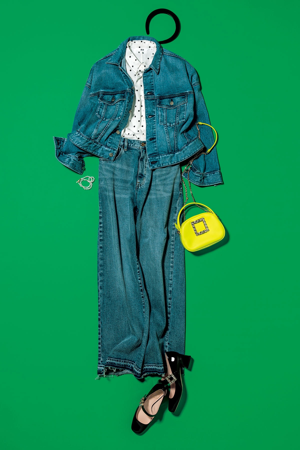 デニム以外は可愛いアイテムで揃えれば絶妙なバランスに。Gジャン¥22,000(ヘルシーデニム/ゲストリスト)パンツ¥12,100(スピック&スパン/スピック&スパン ルミネ有楽町店)シャツ¥2,990(UNIQLO)バッグ¥270,600 パンプス¥204,600(ともにロジェ ヴィヴィエ/ロジェ・ヴィヴィエ・ジャパン)カチューシャ¥24,200(アレクサンドル ドゥ パリ/アレクサンドル ドゥ パリ GINZA SIX店)ブレスレットにしたネックレス¥14,850(エイチ アッシュ/フォーティーン ショールーム)