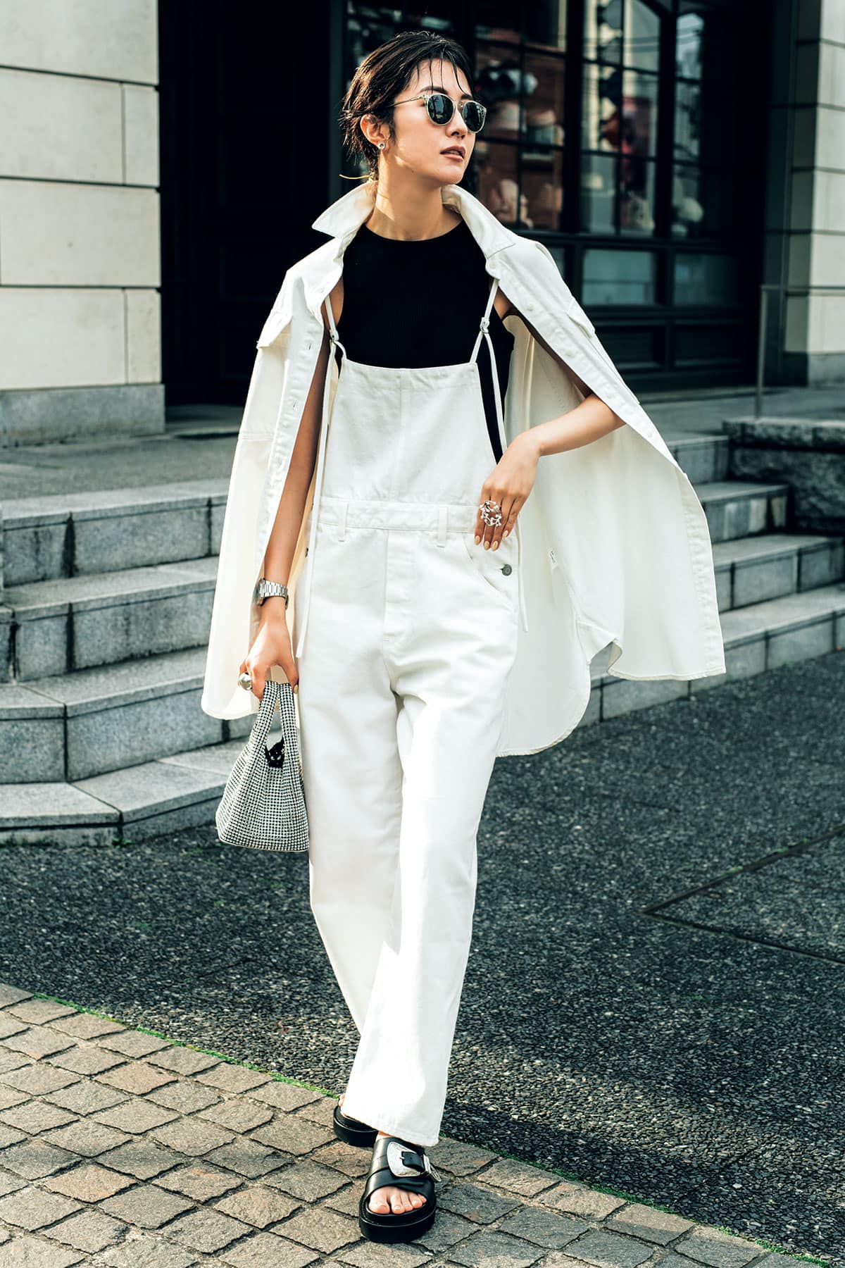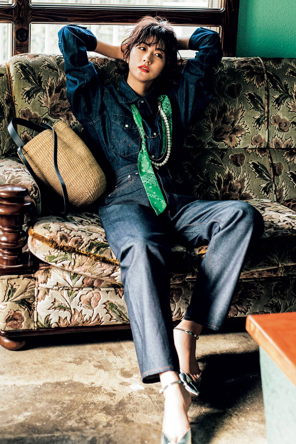 デニム素材のオールインワンとシャツで一味違うデニムONデニムに。シャツ¥36,300 オールインワン¥26,400〈ともにウィム ガゼット〉カットソー¥7,480〈ザ ポーズ〉(すべてウィム ガゼット ルミネ新宿店)バッグ¥47,300(ジアライト/ガリャルダガランテ 青山店)ピアス¥6,600(オクト)サングラス¥40,260(オリバ ーピープルズ/ルックスオティカジャパン カスタマーサービス)時計¥121,000(ディーワン ミラノ/エイチエムエスウォッチストア 表参道)右手リング¥13,200 左手リング¥38,500(ともにマム/ビヨンクール)サンダル¥75,900(トーガ プルラ/ビューティ&ユース ユナイテッドアローズ 丸の内店)