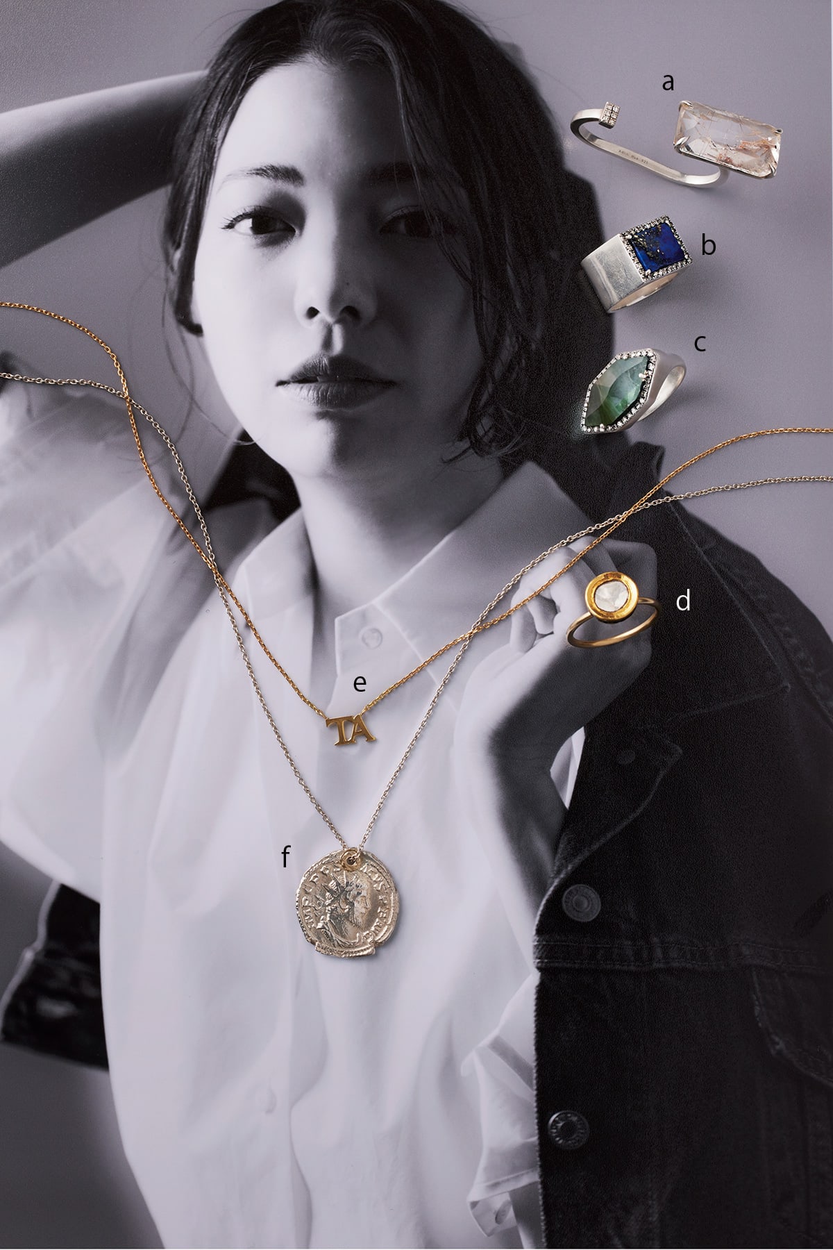 「地球上に既に存在する資源の活用」をコンセプトに、リサイクルシルバーを使用。天然石本来の色合いやフォルムが生かされた神秘的な美しさに心ときめきます。a.One of a Kind Mare Ring b.Minya Pinky Ring c.One of a Kind Canan Ring、すべてアドリンヒュー d.東洋の伝統工芸を掛け合わせたモダンなデザインと職人の手仕事が感じられる作りが魅力。シャランポワのたまつゆ K18 polki diamond ring e.好きなイニシャルを選んで出来上がるシンボリックなアイテム。ジジのInitial necklace 2letter f.シンプルな装いのワンポイントになるコインネックレス。ジジのRoman coin necklace