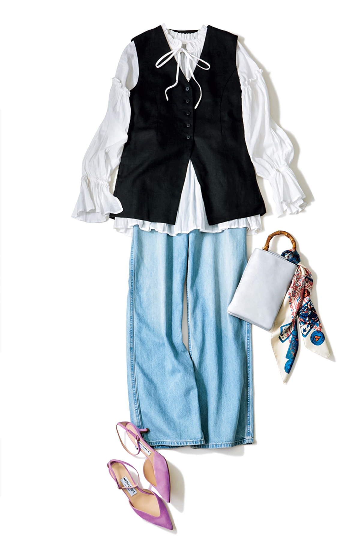 ジレと白ブラウスできれいめ!でもユニクロのデニムでカジュアルに【着回しDiary】