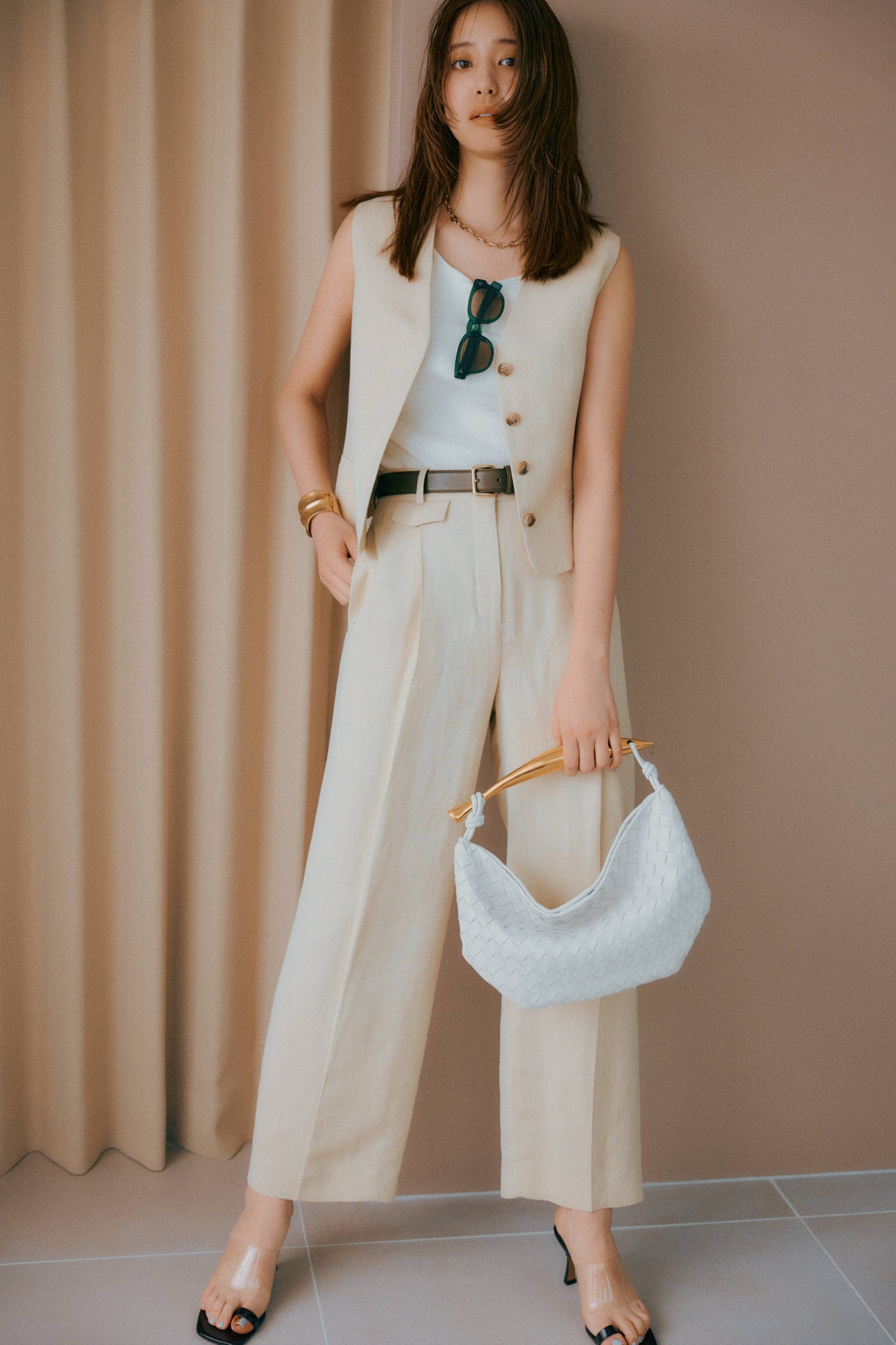 ジレ¥13,500パンツ¥17,500(ともにCOS/COS 青山店)タンクトップ(シャツとのセット)¥19,800(マイストラーダ/マイストラーダ プレスルーム)サンダル¥28,600(ハァウ/ウィム ガゼット ルミネ新宿店)ベルト¥23,100[参考価格](アトリエ アンボワーズ/アマン)サングラス¥62,700(アイヴァン 7285/アイヴァン 7285 トウキョウ)ネックレス¥11,000(イン ムード/フォーティーン ショールーム)バングル¥19,800(ケネスジェイレーン/アルアバイル)