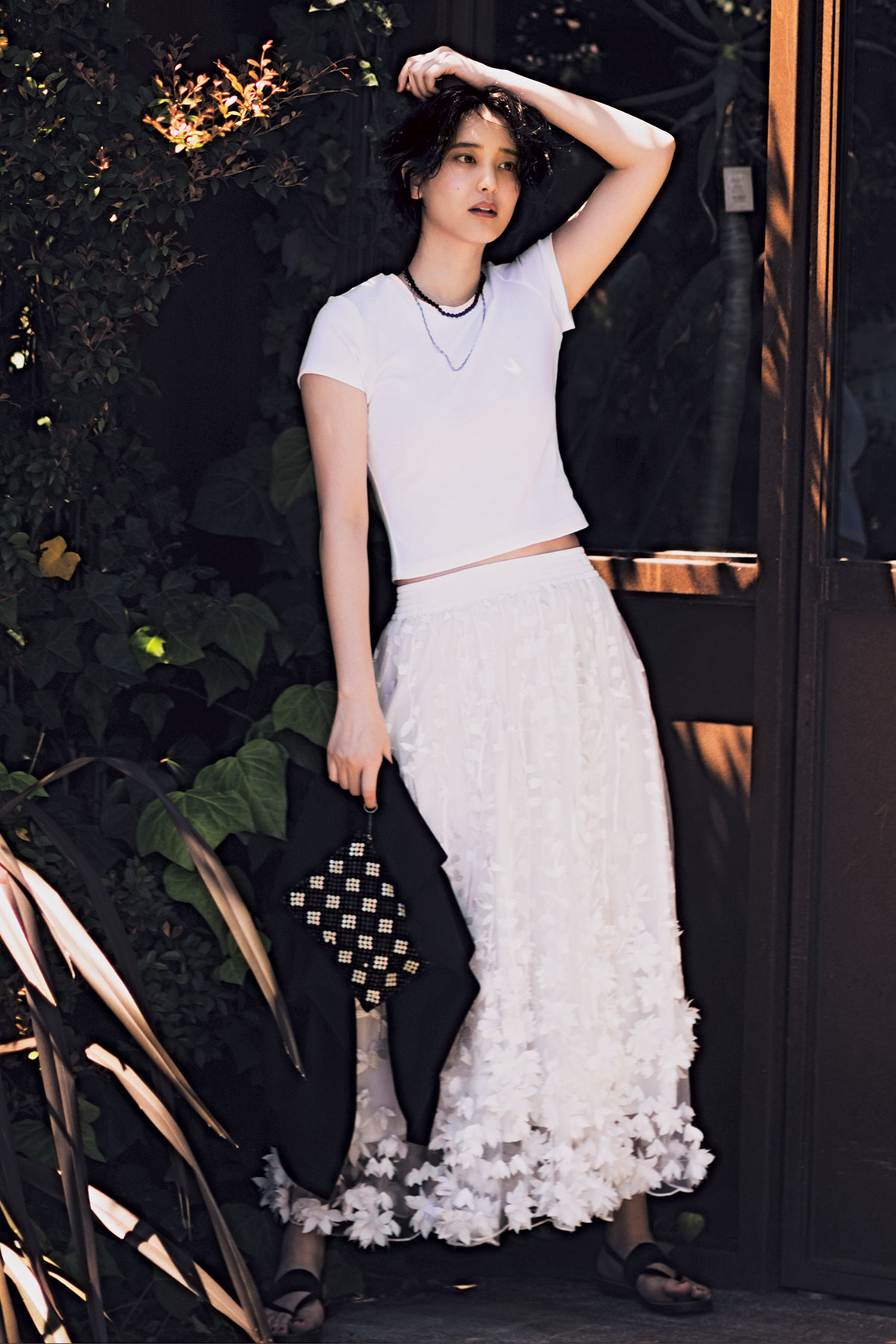 小物は黒で締めて。Tシャツ¥1,000〈ミニT/M〉(UNIQLO)スカート¥47,300(ソブ/フィルム)手に持ったニット¥52,800(エストネーション)ポーチ¥5,940(サンタモニカ 表参道店)黒ネックレス¥27,500(SOPHIE BUHAI/エスケーパーズオンライン)SVネックレス¥38,500(MARIA BLACK/マリア ブラック 表参道店)サンダル¥30,800(ヘレンカミンスキー/ヘレンカミンスキー ギンザシックス店)