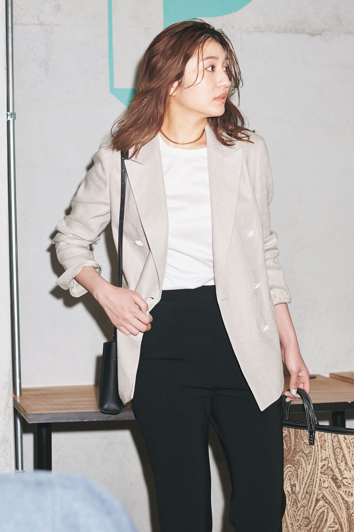 白T×黒パンツの着慣れた通勤コーデも、こなれたジャケットの表情で大人っぽく洗練度もアップ。Tシャツ¥9,680(スローン)ジャケット¥42,900(ユナイテッドアローズ/ユナイテッドアローズ 六本木ヒルズ店)パンツ¥33,000(ベイジ,/オンワード樫山 お客様相談室)ショルダーバッグ¥104,500(ザンケッティ/エリオポール代官山)トートバッグ¥49,500(ア ヴァケーション)ネックレス¥32,400(アビステ)