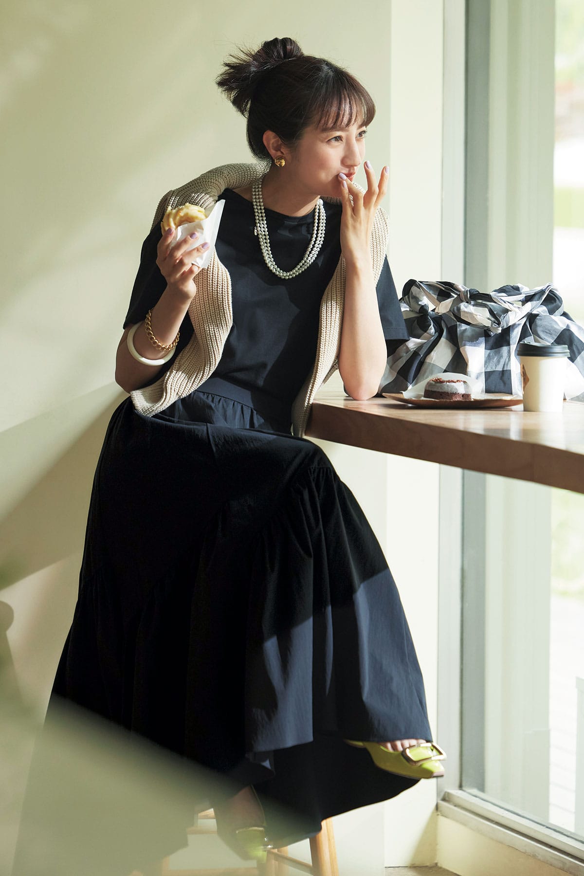 ティアードスカートはTシャツと同じ黒でまとめて、甘さを抑えたワントーンコーデに。Tシャツはあえて少しゆとりのあるサイズを選ぶのがポイント。LADYな装いに一層大人の余裕が漂います。Tシャツ¥12,100(8100/ロンハーマン)スカート¥26,400(アルアバイル)肩にかけたニット¥33,000(スローン)バッグ¥34,100(パピルス/アイネックス)パンプス¥124,300(ロジェ ヴィヴィエ/ロジェ・ヴィヴィエ・ジャパン)イヤリング¥7,560ネックレス¥14,040ブレスレット¥5,400バングル¥8,400(すべてアビステ)