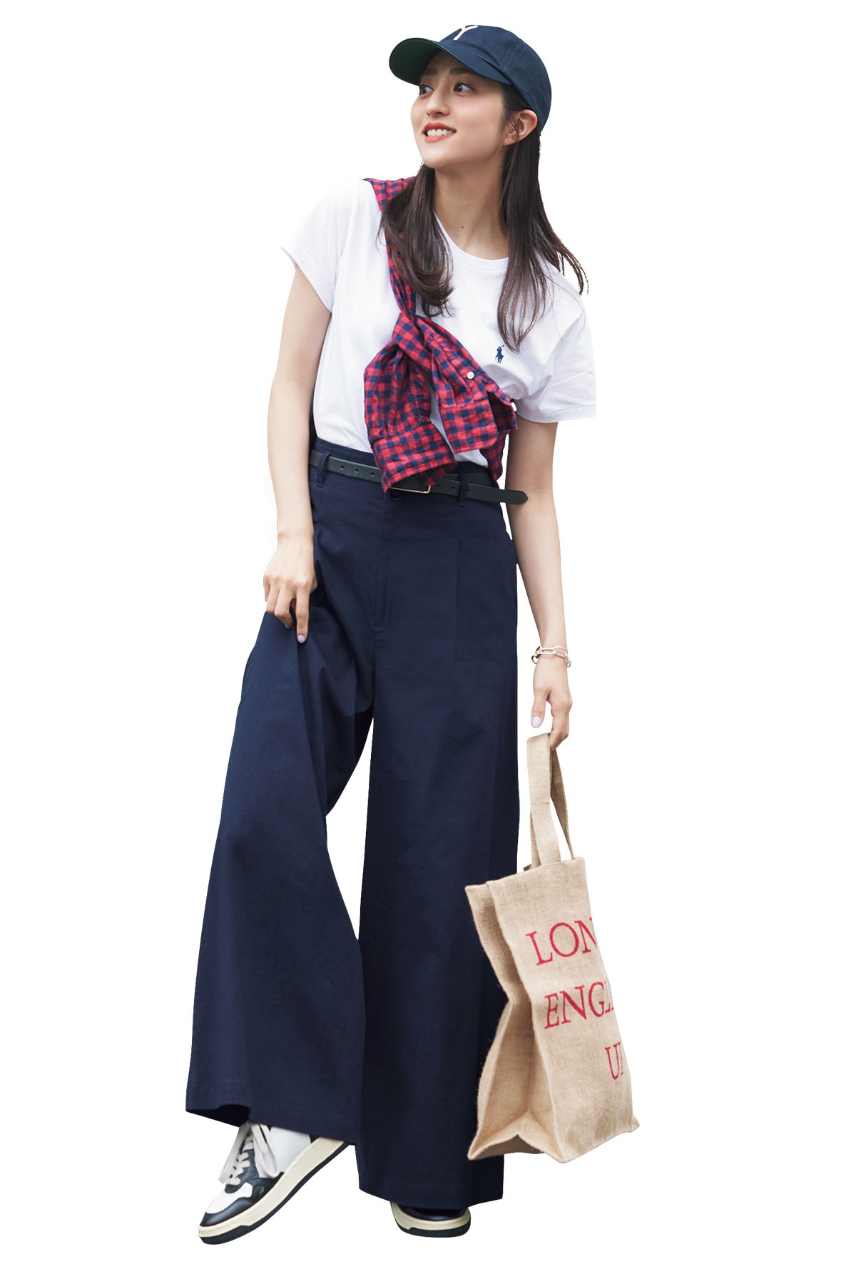 Tシャツ¥11,000(ポロ ラルフ ローレン/ラルフ ローレン)パンツ¥36,300(ロンハーマン)ベルト¥9,680(ザ シンゾーン/シンゾーン ルミネ有楽町店)肩にかけたシャツ¥42,900(フランク&アイリーン/サザビーリーグ)帽子¥10,890(ヤヌーク/カイタックインターナショナル)バッグ¥3,960(メゾン ベンガル/ビーミング ライフストア by ビームス ららぽーとTOKYO-BAY店)スニーカー¥30,800(オートリー/スピック&スパン ルミネ有楽町店)ブレスレット¥11,000(イン ムード/フォーティーン ショールーム)