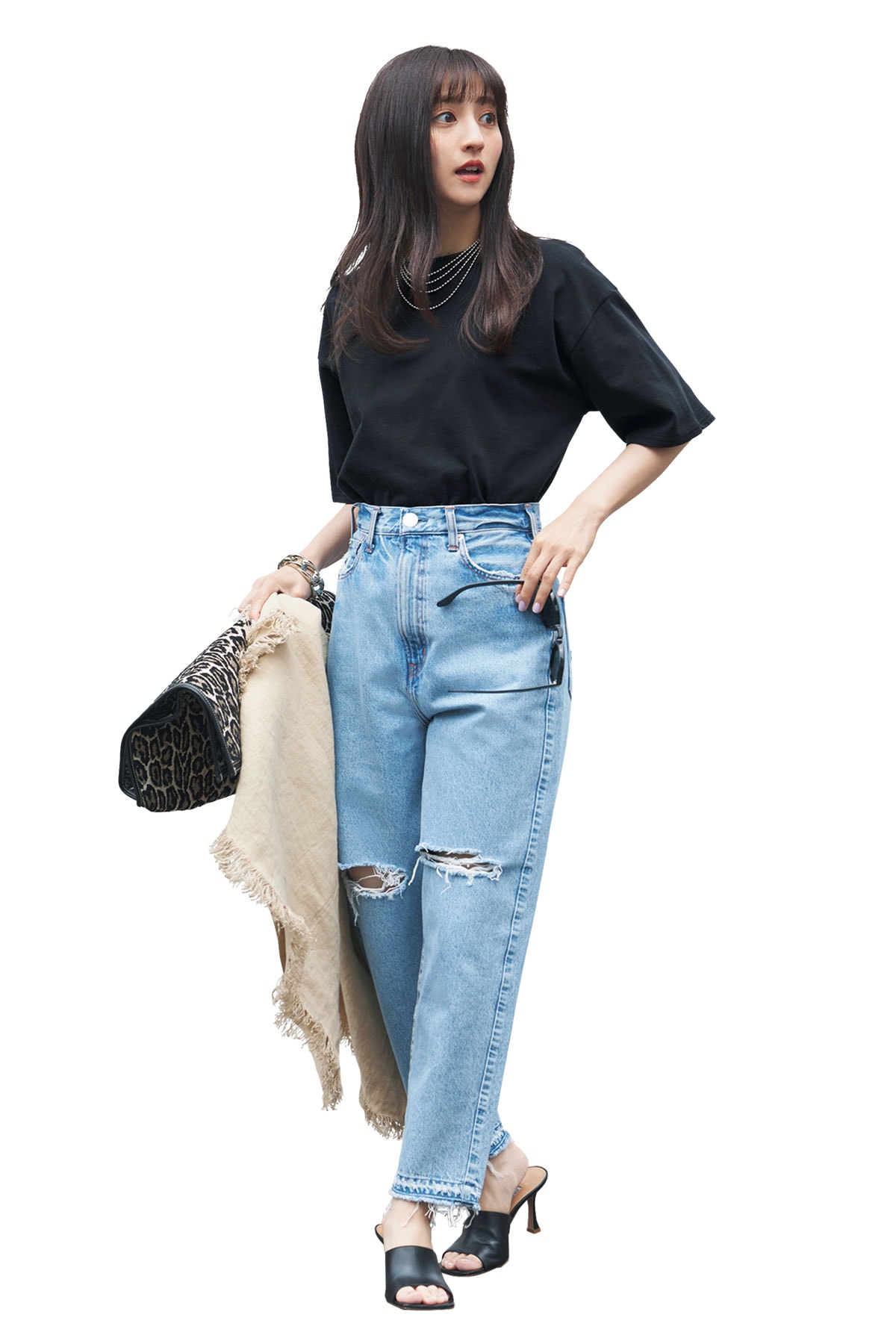 夏らしいライトブルーのダメージデニムをチョイス。淡色デニムを黒Tがシャープに引き締めます。Tシャツ¥4,290(ビーミング by ビームス/ビーミング ライフストア by ビームス ららぽーとTOKYO-BAY店)デニムパンツ¥20,900(ニードバイヘリテージ/ゲストリスト)バッグ¥60,500(ア ヴァケーション/ノーベルバ)ストール¥39,600(アソース メレ/アイネックス)サンダル¥57,200(ペリーコ/アマン)サングラス¥46,200(モスコット/モスコット トウキョウ)バングル¥6,480(アビステ)ネックレス¥11,000(イン ムード/フォーティーン ショールーム)