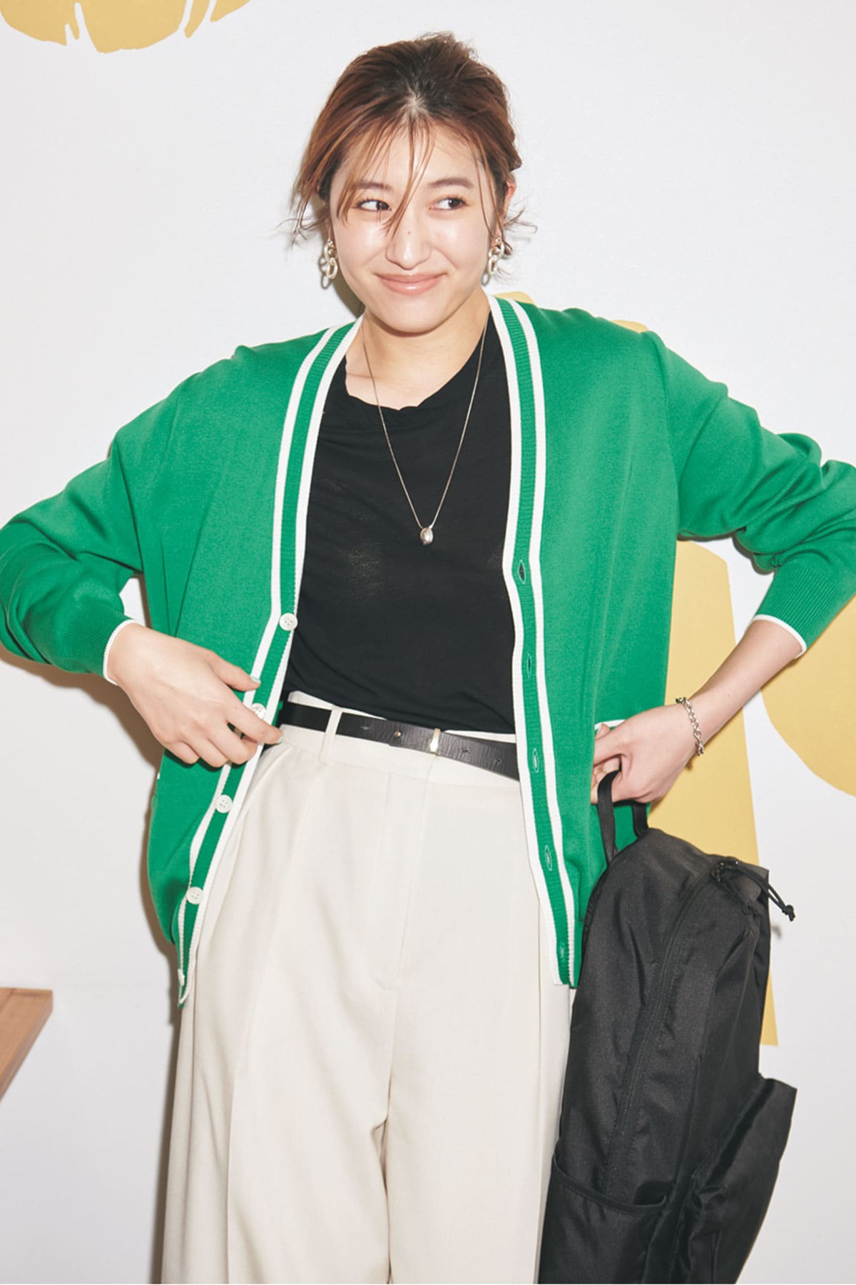 スマートさとアクティブさを両立させる、目を引くフレッシュなグリーン。ゆるっとした余裕のあるシルエットが、オフィカジに真面目すぎない余韻を残します。Tシャツ¥9,900(ファイブ アウェアネス/カレンソロジー 新宿)カーディガン¥36,300(スローン)パンツ¥50,600(ebure/ebure GINZA SIX店)バックパック¥8,250(ニューエラ)ピアス¥12,960(アビステ)ネックレス¥40,700 ブレスレット¥39,600(ともにマリハ)