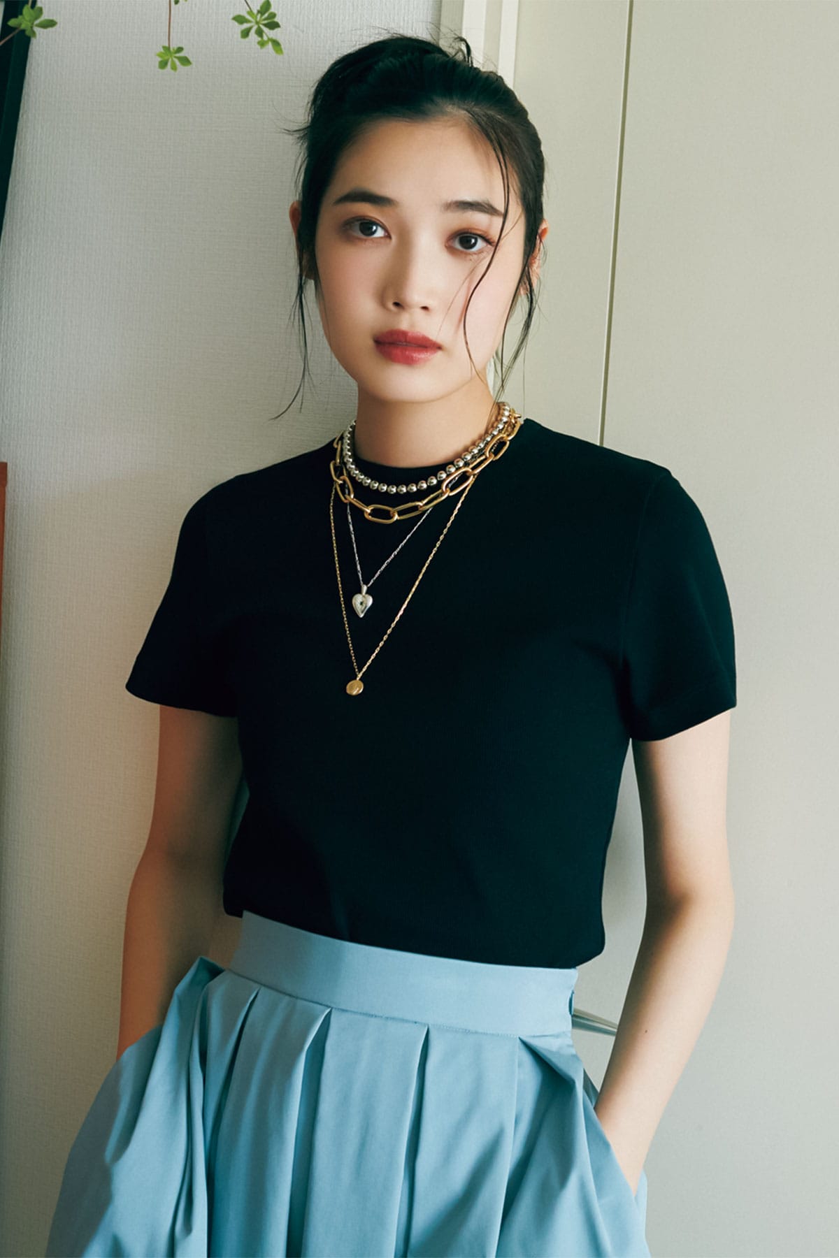 ジャストサイズで首や肩まわりもコンパクトなクルーネックTシャツは、大胆に4本重ねて物足りなさを払拭。着けてみると、意外となじむ!長さの違いを活かしながら、シルバーとゴールドのミックス感でオシャレなムードを後押し。Tシャツ×スカートスタイルも甘くなりすぎない。Tシャツ¥3,990(PLST)スカート¥25,300(ノーク/クロスプラス)