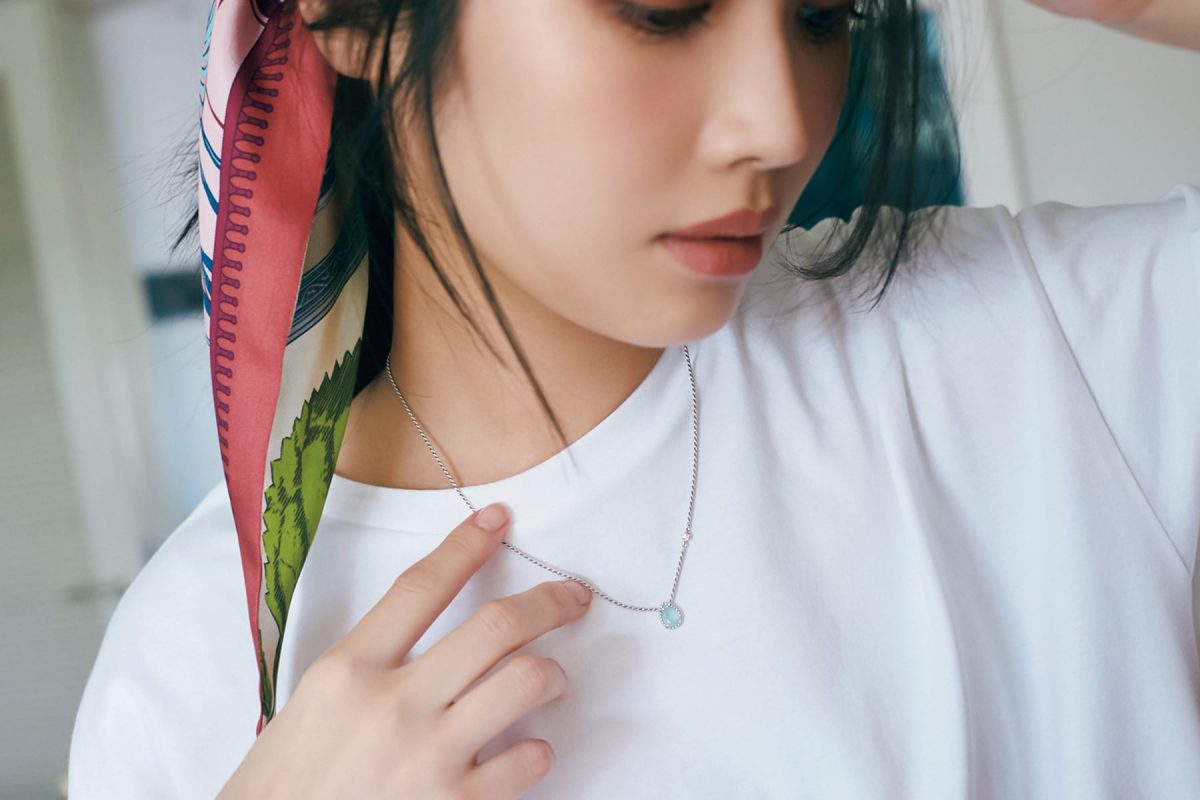 他にはない美しい透け感を持った宝石を、ホワイトゴールドが引き立てるデザイン。サイドの一粒ダイヤモンドもワンポイントになるから、潔く真っ白の無地Tシャツに合わせたい。ネックレス「セルパンボエム」〈WG×アクアプレーズ×D〉¥257,400(ブシュロン/ブシュロン クライアント サービス)Tシャツ¥13,200(デパリエ/デパリエ ニュウマン新宿店)スカーフ¥14,300(マニプリ/エストネーション)