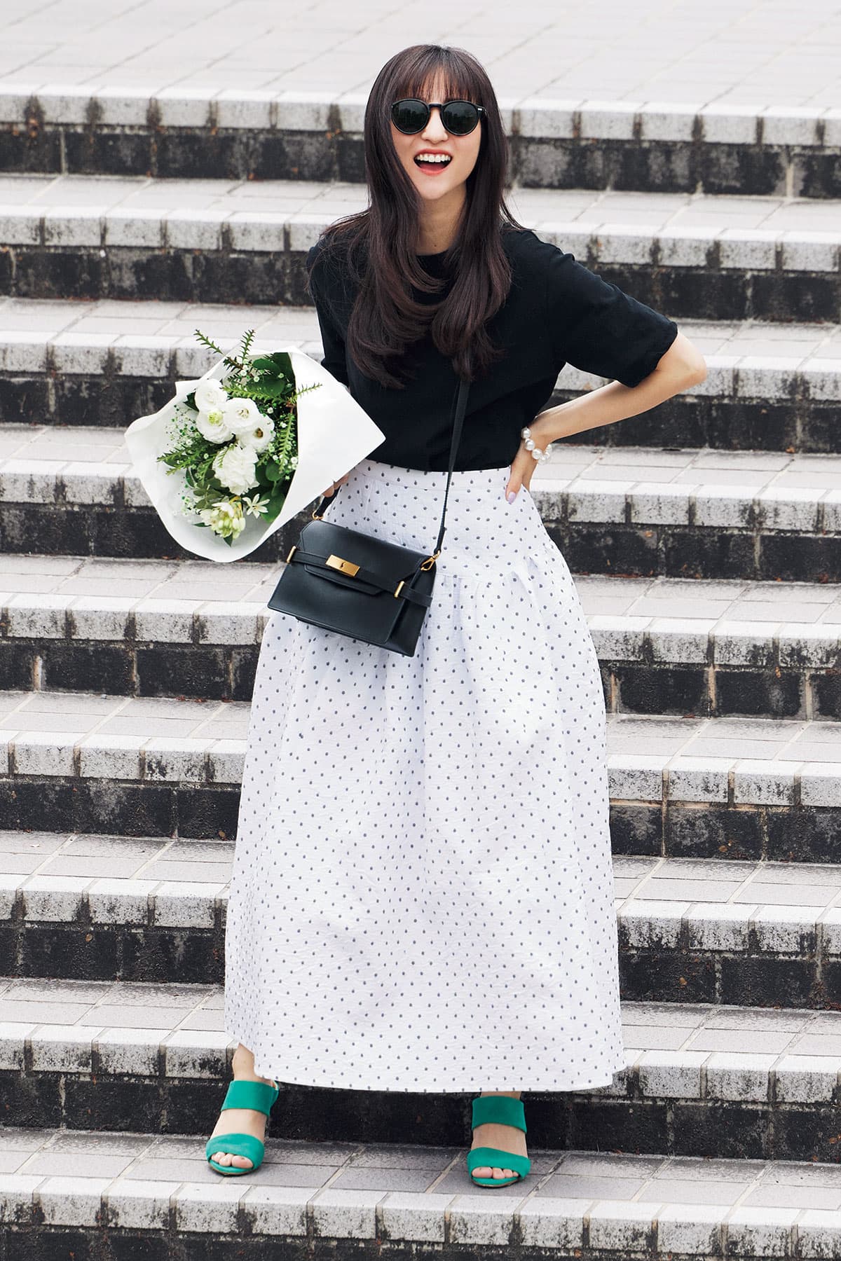 カジュアルと女らしさのバランスが上手な、パリジェンヌをイメージしたモノトーンコーデ。フレアスカートのドット刺繍が、モノトーンに小粋なリズムを刻みます。Tシャツ¥14,300(エイトン/エイトン青山)スカート¥23,100(アルページュストーリー/アルページュストーリー プレスルーム)バッグ¥75,900(ポロ ラルフ ローレン/ラルフ ローレン)サンダル¥40,700(エストネーション)サングラス¥46,200(モスコット/モスコット トウキョウ)ブレスレット¥12,960(アビステ)