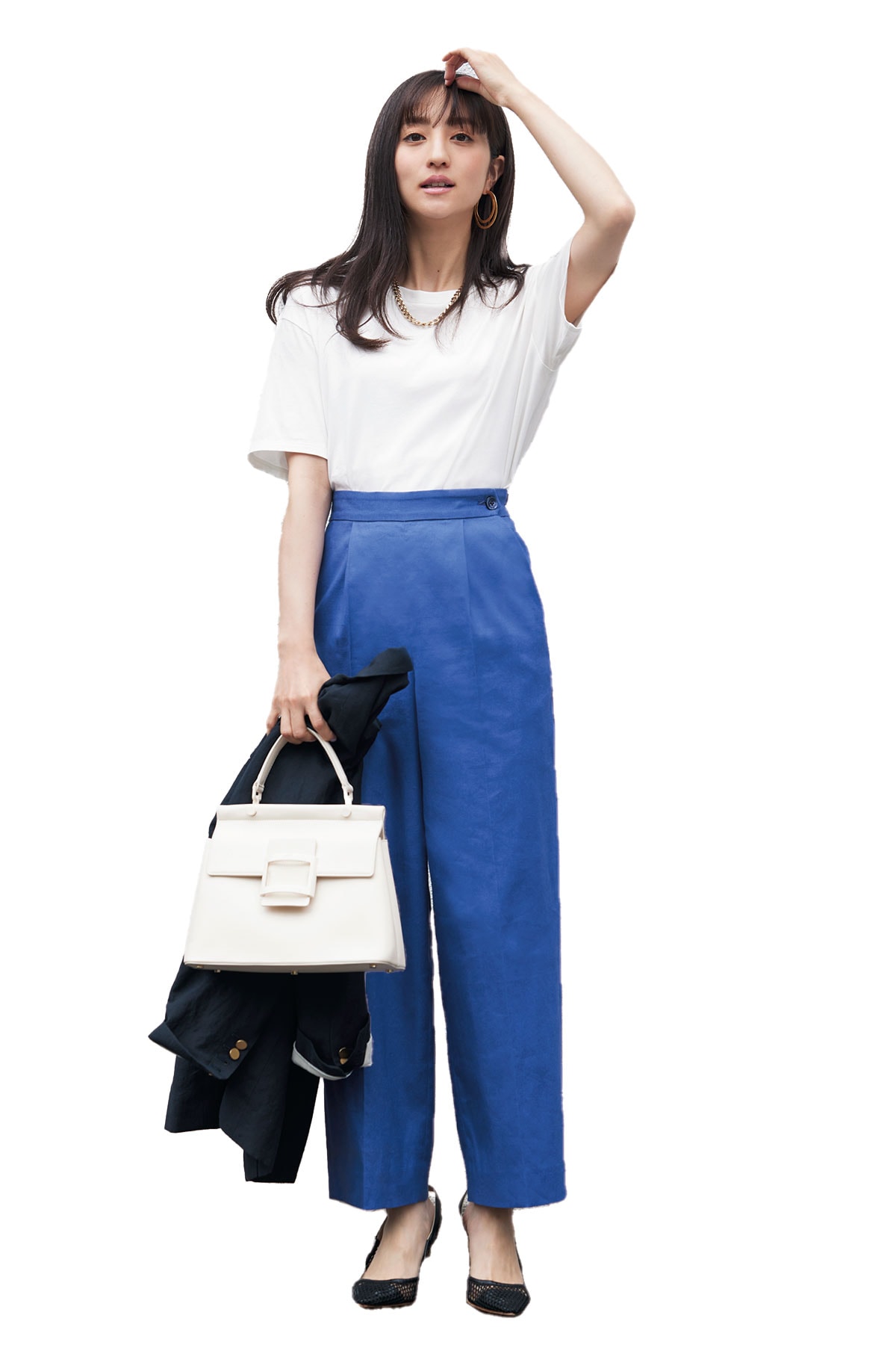 通勤シーンでも夏の主戦力として活躍する白T。自分らしい色のパンツで、日常に高揚感を。Tシャツ¥15,400(ザ・テラス)パンツ¥20,900(ユナイテッドアローズ/ユナイテッドアローズ 有楽町店)手に持ったジャケット¥75,900(カバナ/アマン)バッグ¥399,300(ロジェ ヴィヴィエ/ロジェ・ヴィヴィエ・ジャパン)パンプス¥36,300(ファビオ・ルスコーニ/アルアバイル)ピアス¥7,770ネックレス¥9,720(ともにアビステ)