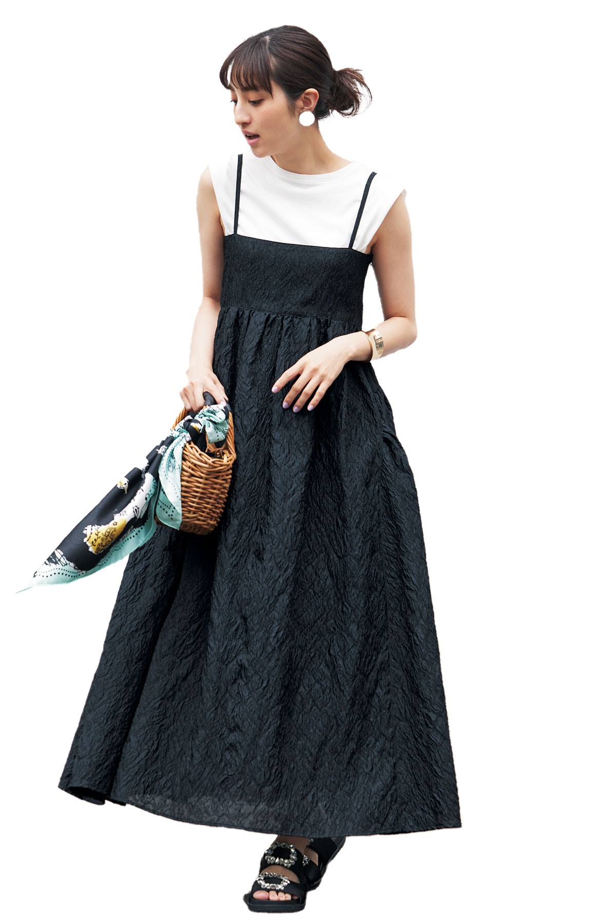 ハリのある素材のキャミワンピなら白Tレイヤードがモダンに仕上がる