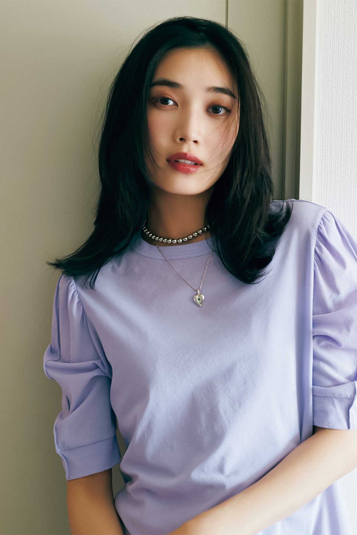 ラベンダーカラーとパフスリーブが可憐なTシャツは、コンサバになりすぎないようなアクセ選びに集中して。辛口かつカジュアルに仕上がるシルバーのボールネックレスを、Tシャツのネックに沿うように。繊細チェーンのハートペンダントと重ねることで、ワンランク上のTシャツスタイルが完成します。Tシャツ¥18,700(チノ/モールド)