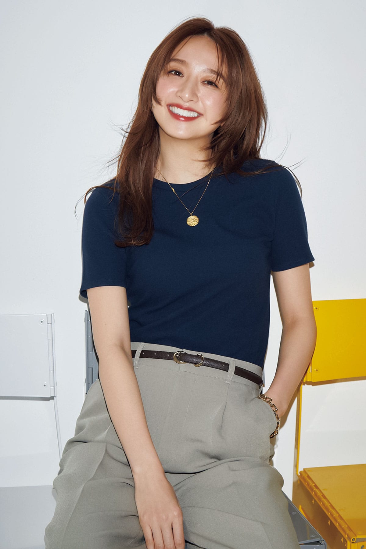 フェミニンな細身のレザーベルトは、タックパンツやセンタープレスパンツにぴったり。きちんと感を上乗せしてくれる効果も。Tシャツ¥9,900(ユナイテッドアローズ/ユナイテッドアローズ 六本木ヒルズ店)パンツ¥27,500(アルアバイル)ベルト¥8,800(ガリャルダガランテ/ガリャルダガランテ 青山店)ネックレス¥22,000(マリハ)ブレスレット¥5,250(アビステ)