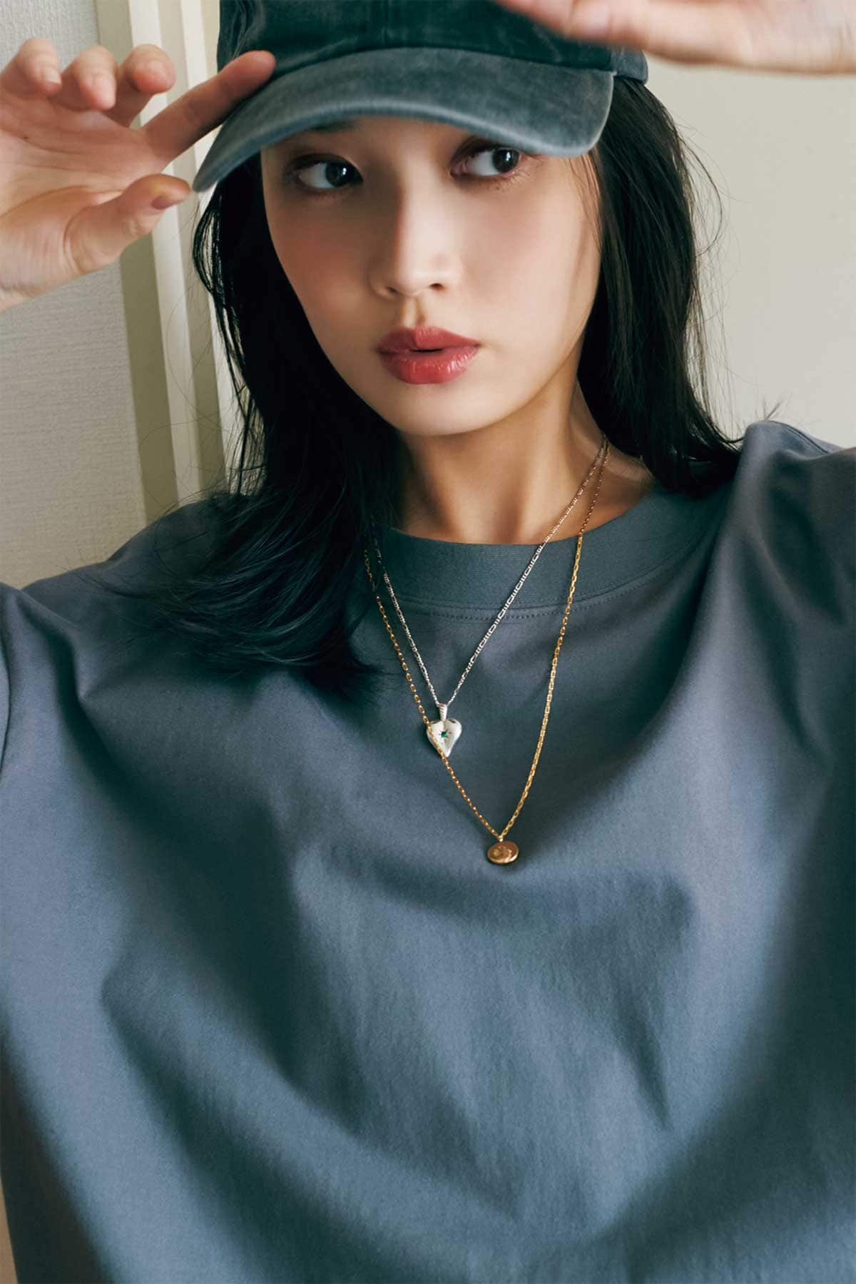 プレーンなTシャツはコーディネートがシンプルすぎたり、ストイックになりがち。そんな時はモチーフの効いた華奢ペンダントの出番です。長さの異なるシルバーとゴールドを組合せることで、Tシャツスタイルに奥行きとこなれ感が。Tシャツ¥15,400(ハイク/ボウルズ)キャップ¥1,650(フルーツオブザルーム/ギャレット)