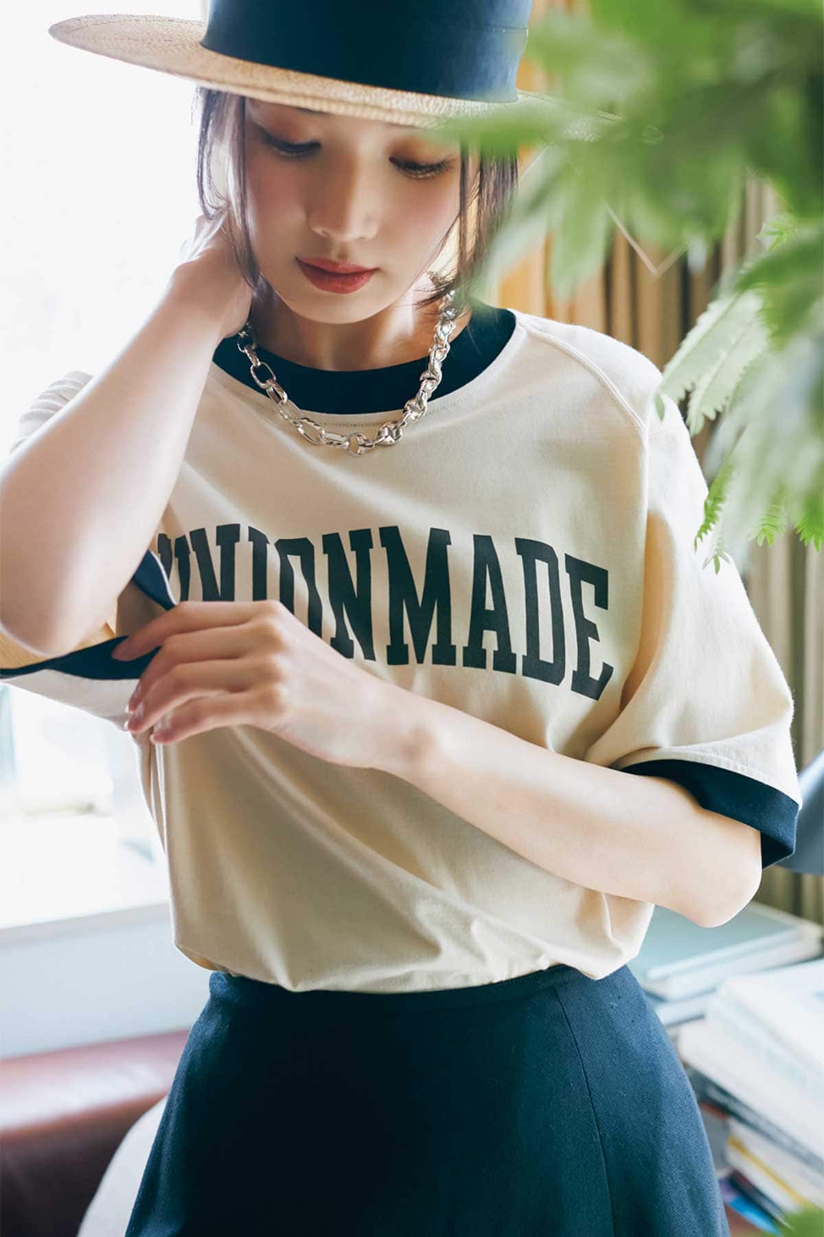 クールなシルバーチェーンはデザイン性のあるロゴTにぴったり。フレンチシックをモダンにアップデート。ネックレス¥42,900(リューク)ハット¥19,800(Chapeau dʼ O/Chapeau dʼ O 東急プラザ銀座店)Tシャツ¥19,800スカート¥53,900(ともにユニオン ランチ/サザビーリーグ)