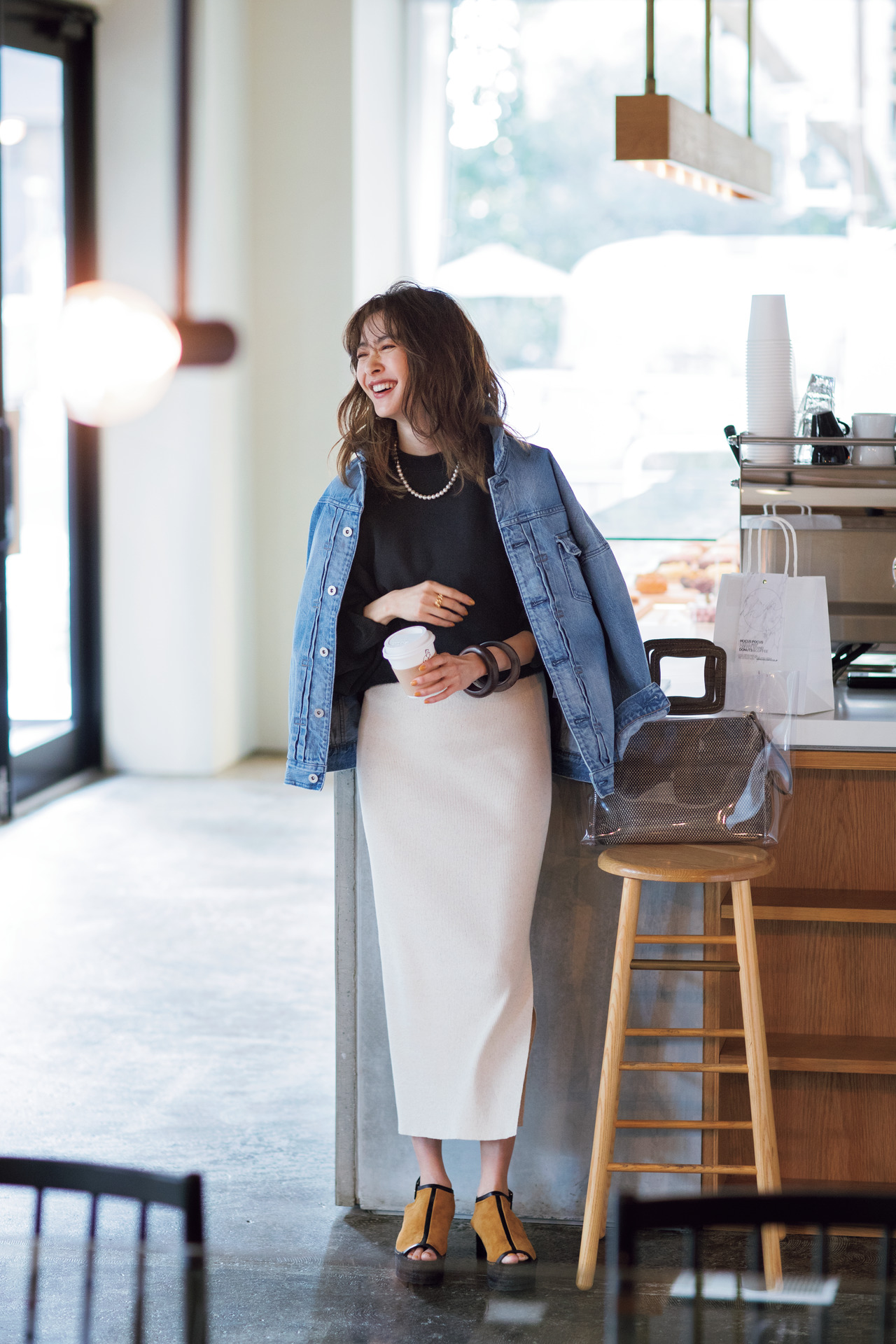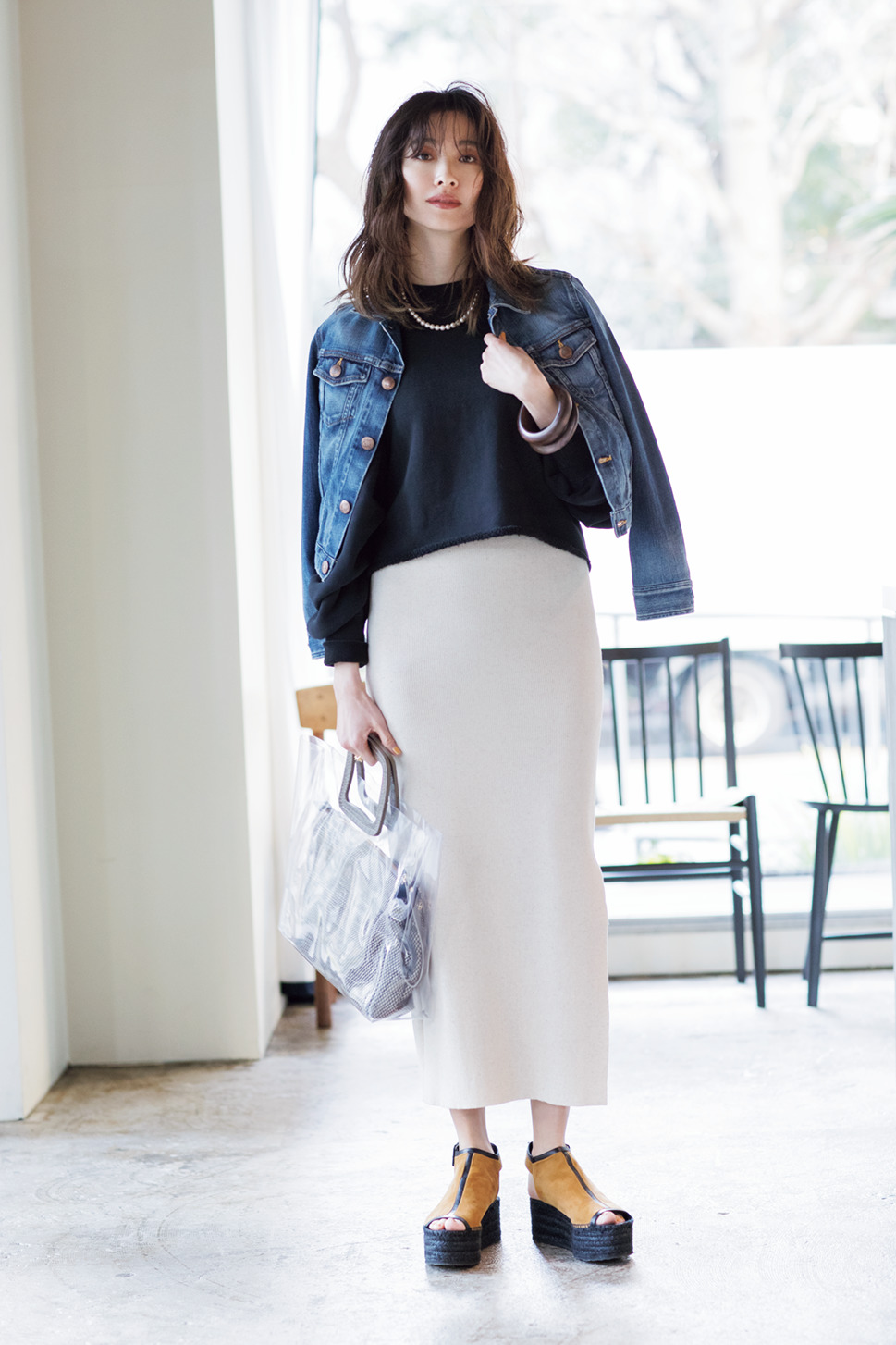 Gジャン¥32,000(アッパーハイツ/ゲストリスト)スウェットトップス¥23,000(ハイク/ボウルズ)ニットスカート¥18,000(ドローイング ナンバーズ/ドローイング ナンバーズ 南青山店)パールネックレス¥2,900(JUICY ROCK)リング¥6,000(ワンエーアールバイウノアエレ/ウノアエレ ジャパン)ウッドバングル[太]¥4,000ウッドバングル[細]¥3,700(ともにアリシャディー/シップス 有楽町店)サンダル¥70,000(ピエールアルディ/ピエール アルディ 東京)バッグ¥26,000(アニタ ビラルディ/レリタージュ マルティニーク)