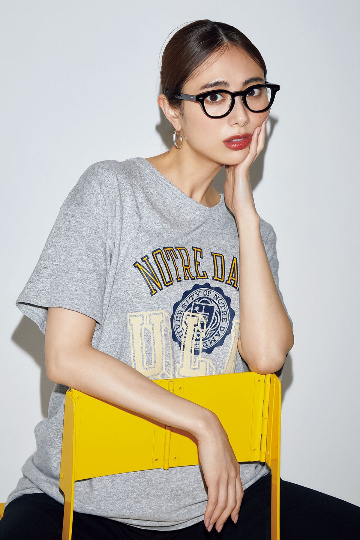 Tシャツと合わせる時は普通のメガネよりちょっとインパクト強いくらいで大丈夫!濃いめリップや大きめピアスで顔周りを盛れば、さらに完成度が高まります。Tシャツ¥20,900(ユニオン ランチ/サザビーリーグ)メガネ¥50,600(アイヴァン/アイヴァン 東京ギャラリー)ピアス¥21,010(パズ・コレクティブ/ZUTTOHOLIC)その他スタイリスト私物