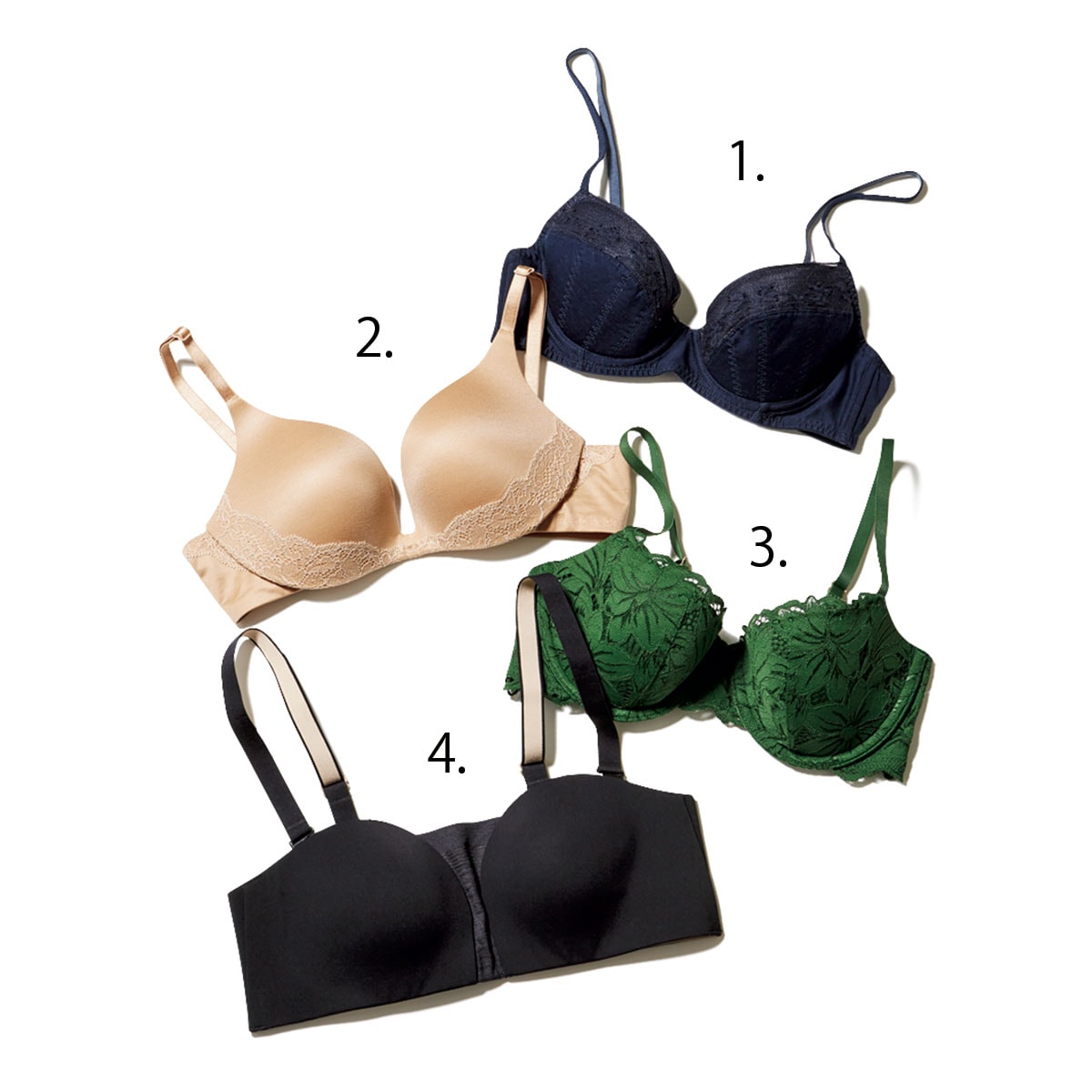 1.サイドボーンで丸みのあるバストに。スウィート スウィート 3/4カップブラ¥17,600(ランジェリーク/カドリールインターナショナル)2.ドリームブラ¥4,500(PEACH JOHN)3.Aerie Real Power バルコネット Beach Daze レースブラ¥6,490(Aerie/AEOサポート)4.アタリが出にくいシームレスタイプ。フレックス スマート551 ノンワイヤーブラジャー¥8,690(トリンプ/トリンプ・インターナショナル・ジャパン)