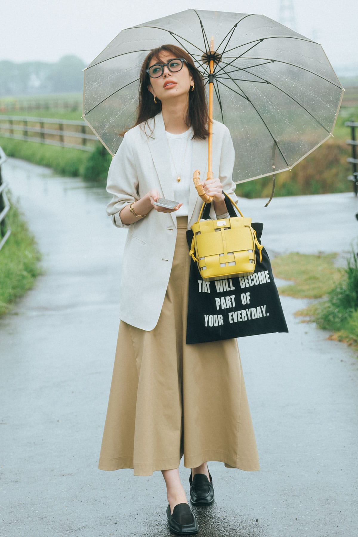 雨も止まないし、なんか、最悪。メガネ¥8,800(ゾフ/ゾフ カスタマーサポート)イエローバッグ¥157,300(ザンケッティ/エリオポール代官山)ロゴトートバッグ[撥水]¥8,800(マルモア/DMC)ローファー[撥水]¥30,800(シーセイ/アイネックス)傘¥11,000(トラディショナル ウェザーウェア/トラディショナル ウェザーウェア ルミネ有楽町店)ピアス¥39,600(リューク)ドロップネックレス¥24,090(ソコ/ZUTTOHOLIC)チェーンブレスレット¥6,300(アビステ)