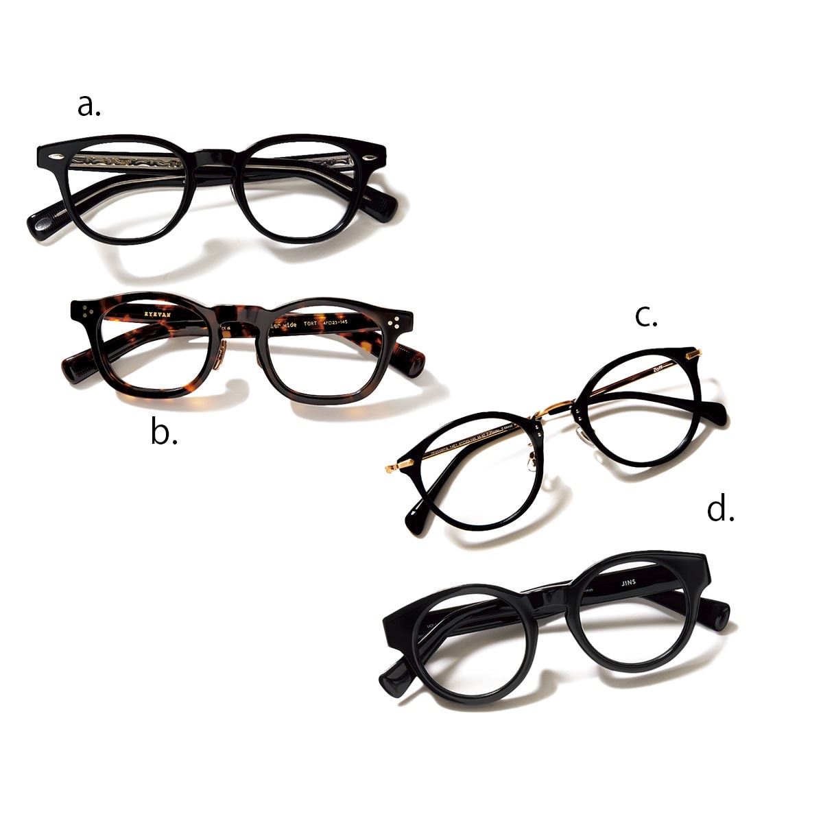 合わせやすいウェリントンやボストンタイプの大きめフレームがオススメ。a.【モデル着用】メガネ¥50,600(アイヴァン/アイヴァン 東京ギャラリー) b.べっこう素材で肌なじみもバッチリ。¥50,600(アイヴァン/アイヴァン 東京ギャラリー)c.細身のボストン。¥13,300〈セットレンズ代込み〉(ゾフ/ゾフ カスタマーサポート)d.太フレームで洒落感UP。¥9,900(JINS/JINS カスタマーサポートセンター)