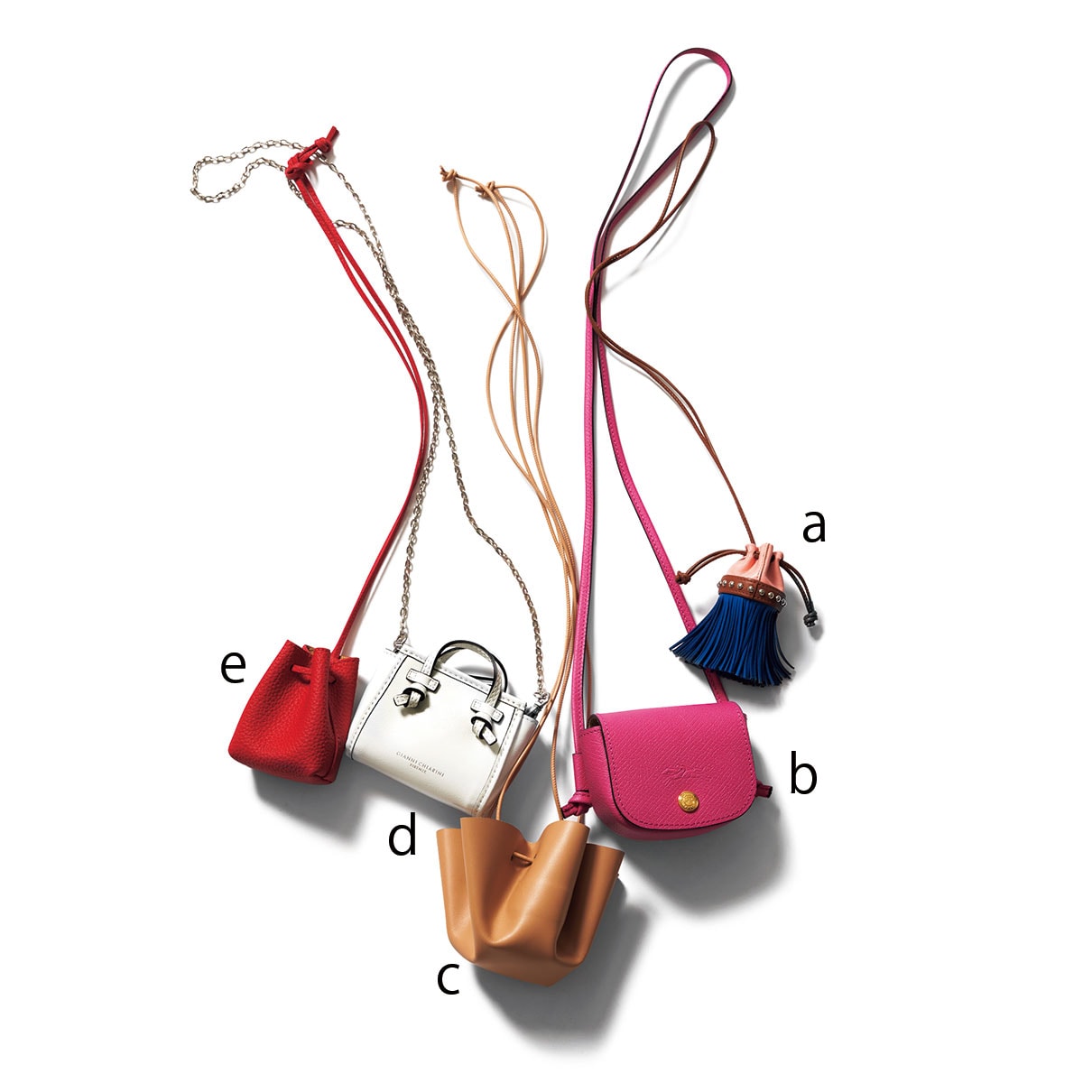 a.【モデル着用】チャーム¥39,600(J&M デヴィッドソン/J&M デヴィッドソン カスタマーセンター)b.人気の「エピュレ」の本革コインケース。¥26,400(ロンシャン/ロンシャン・ジャパン)c.イタリア発の注目ブランド。¥11,000(レフィエ/フラッパーズ)d.「マイクロ マルチェラ」はこの他にもカラバリ豊富!¥18,700(ジャンニ キアリーニ/ジャンニ キアリーニ銀座店)e.アイコン「BOND」を極小化した別注はキーケースとしても。¥15,400(ヴァジック×デミルクス ビームス/デミルクス ビームス新宿)