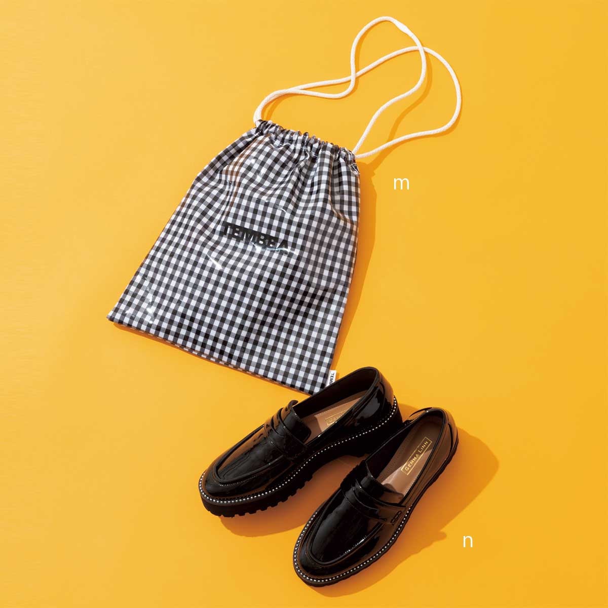 m.<防水>PVCコーティングで防水性あり。巾着型で中身が濡れにくいのも◎。ギンガムチェックバッグ¥8,250(テンベア)n.<防水>スタイリッシュなスタッズつきのレインローファー。ソールとアッパーの間に防水テープが施され雨の浸入を防御。厚底でスタイルアップ効果も。ローファー¥17,600(ダニエラアンドジェマ)