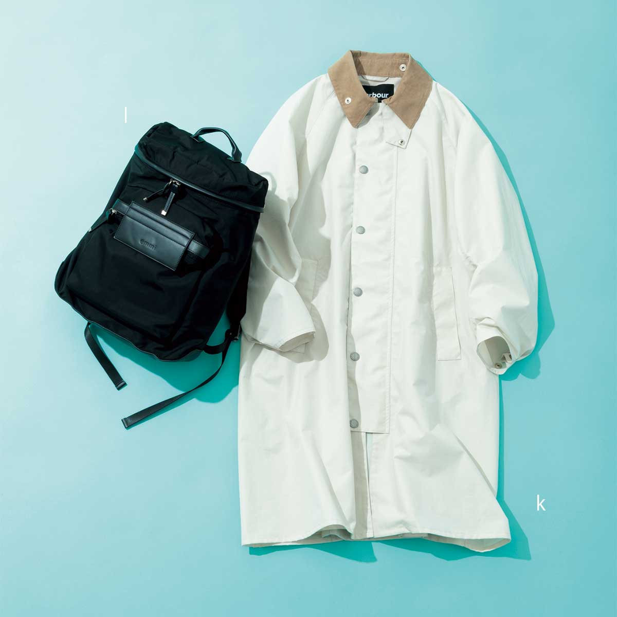k.<撥水>軽い撥水性とシワになりにくさが特徴のミドル丈コート。スカートともパンツとも好相性です。コート¥51,700(バブアー/バブアー パートナーズ ジャパン)l.<撥水>ECO素材&撥水加工に加え、ポケットやファスナーなど細部までこだわった優秀設計。リュック¥14,850(エミ アトリエ/エミ ニュウマン新宿店)