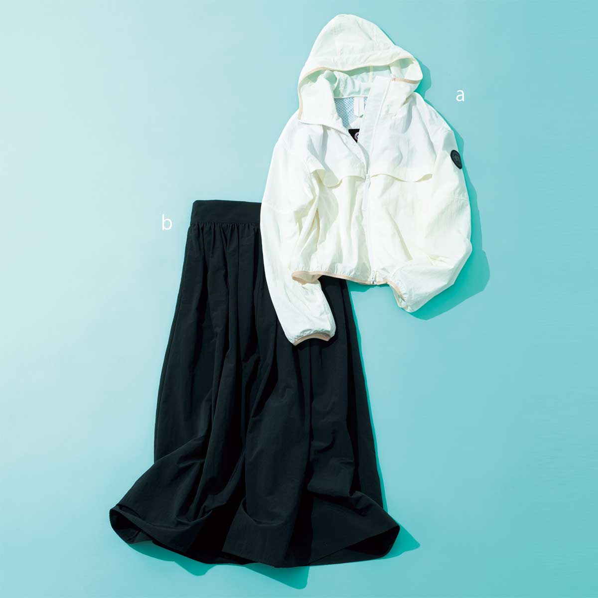 a.<撥水>前後にベンチレーション入りで通気性も◎。軽い着心地でかさばらず、旅行など持ち運びにも便利。ブルゾン¥81,400(カナダグース)b.<撥水>撥水、UVカット、接触冷感効果あり。カジュアルすぎず、通勤などキレイめな装いにもマッチします。フレアスカート¥16,940(アンクレイヴ スタンダード/アンクレイヴ)