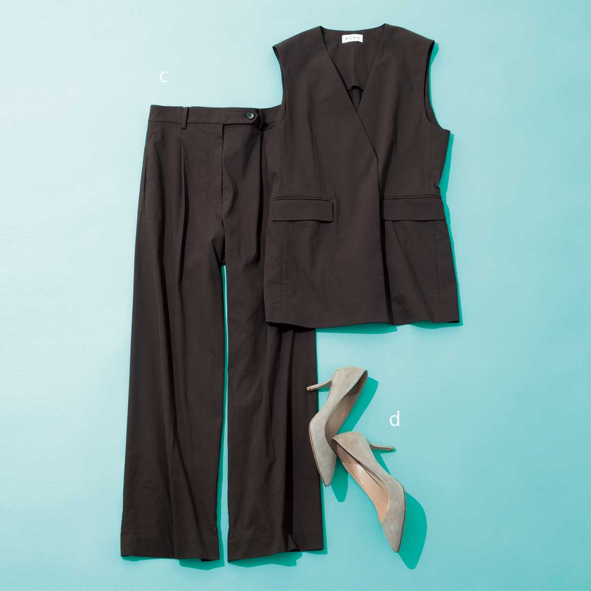 c.<吸水速乾>吸水速乾機能&UVカットで、真夏まで長く活躍。着心地のよいハイストレッチ素材。ジレ¥17,000ワイドパンツ¥12,000(ともにPLST)d.<防水>雨の日に難しそうな明るめカラーのスエードパンプスも晴雨兼用なら安心。7.5㎝ヒールで美脚効果も抜群。パンプス¥25,300(銀座かねまつ/銀座かねまつ6丁目本店)