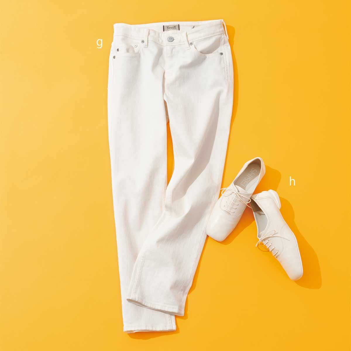 g.<撥水・防汚>撥水・防汚機能あり。水滴を弾きつつ、湿気は逃してくれるのでサラッとはける。デニムパンツ¥25,300(ヤヌーク/カイタックインターナショナル)h.<撥水>ビブラム社製のヒールパーツとアウトソールを採用。グリップ力が強く、滑りやすい雨の日の駅や階段でも安心。シューズ¥28,600(シーセイ/アイネックス)