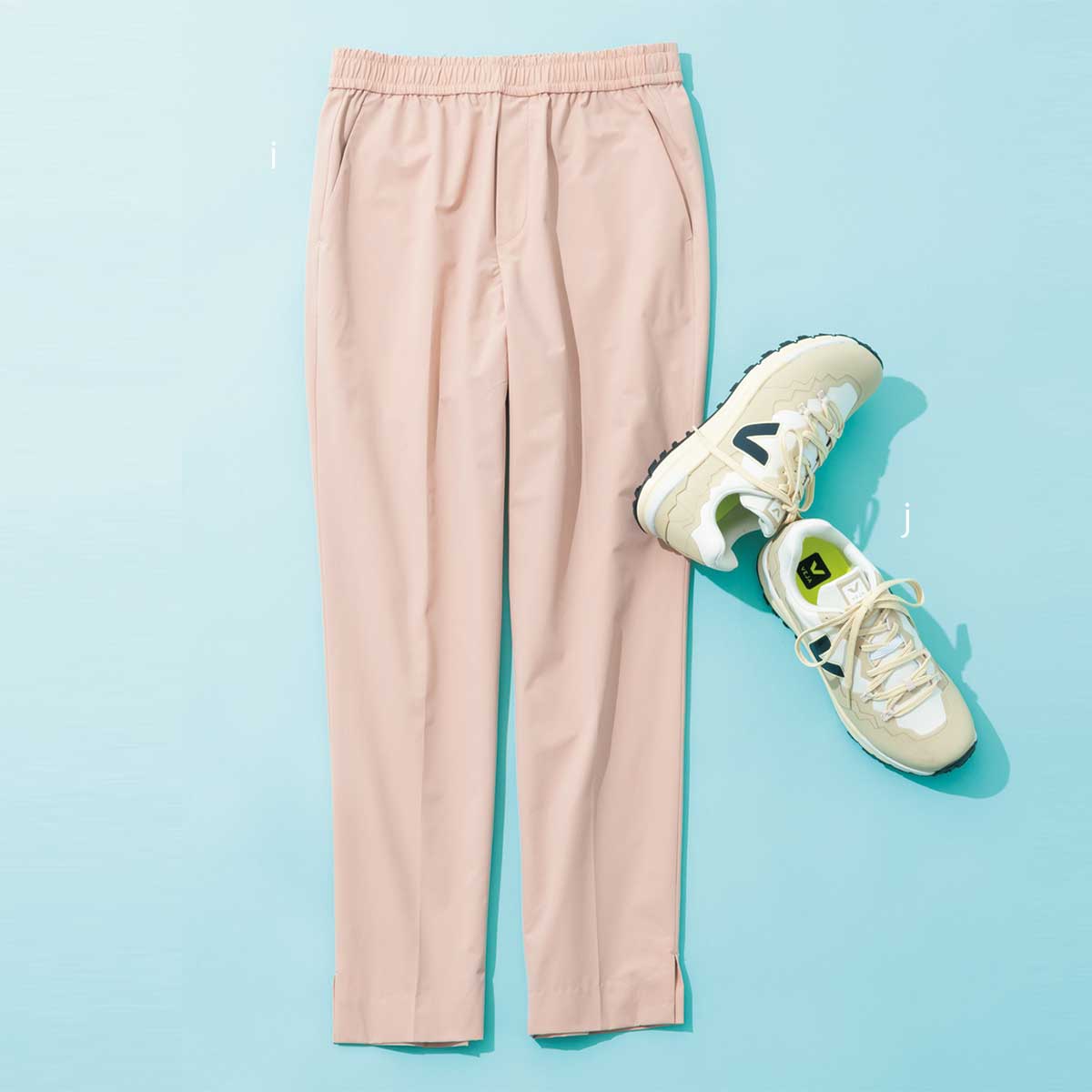 i.<撥水・吸水速乾>UVカット、軽量、360度ストレッチ、撥水、吸水速乾性抜群という高スペックな一本。さらりとしたドライな質感ではき心地も快適。センタープレスが脚を真っ直ぐ見せてくれます。パンツ¥6,990(アンフィーロ)j.<撥水>生地に耐久撥水加工で、小雨の日やアウトドアにも対応。スニーカー¥34,100(ヴェジャ)