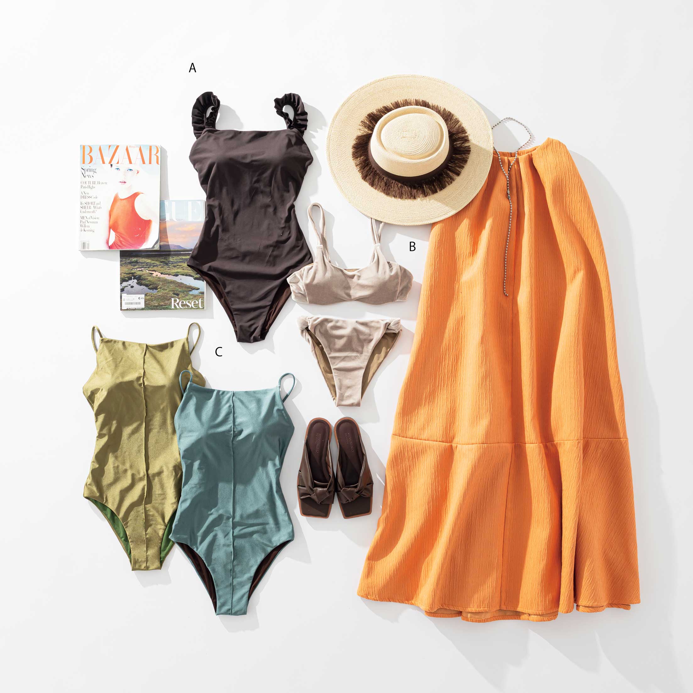 ワンピースタイプの水着は前をしっかり隠した分、バックスタイルは大胆に開けたデザインでメリハリを。グリッター生地がときめき感も叶えてくれる。A.水着¥17,820B.ビキニトップ・ボトム¥18,480※セット価格C.水着各¥17,820ワンピース¥22,880ハット¥15,800〈Brixton〉ネックレス¥7,920サンダル¥14,080(すべてroom306 CONTEMPORARY)