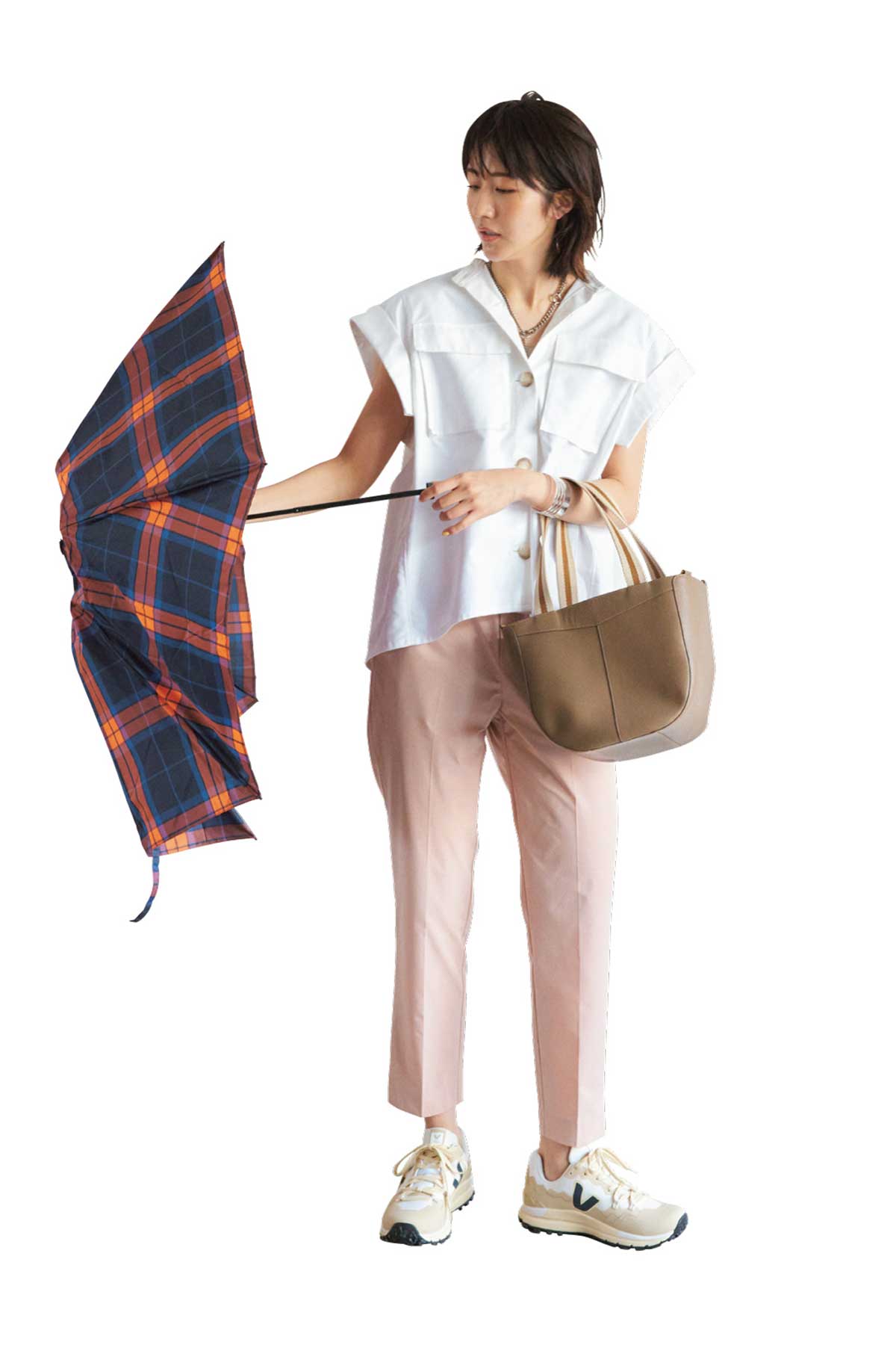 スクエアショルダーがスタイリッシュな撥水・撥油加工のシャツでハンサムにまとめて。トラッドな印象のチェック柄の折り畳み傘は、シンプルなコーデのアクセントにも一役買います。シャツ¥29,800(TEECHI)パンツ¥6,990(アンフィーロ)折り畳み傘¥9,350(マッキントッシュフィロソフィー/ムーンバット)バッグ¥49,500(アタオ/スタジオアタオ)スニーカー¥34,100(ヴェジャ)ネックレス¥9,900(イン ムード/フォーティーン ショールーム)バングル¥8,100(アビステ)