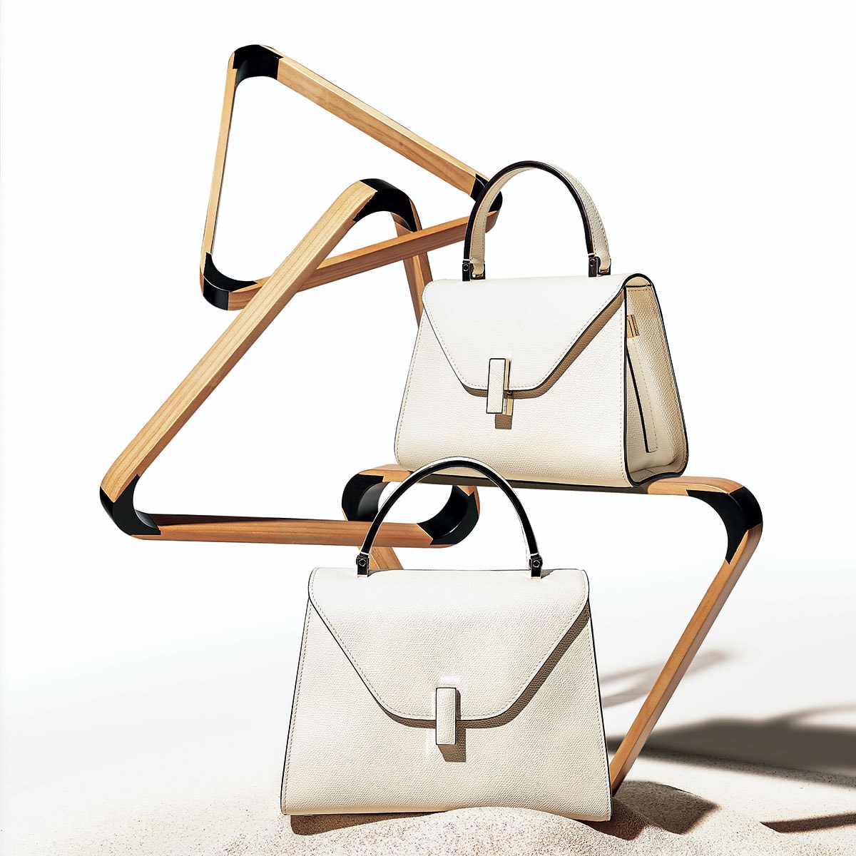 素材は上質なソフトカーフスキン。重さはミニサイズで500gと、きちんとしたイメージに反して、手に取ると思ったより軽やかなところに驚くはず。バッグ「イジィデ」ミディアム〈H20×W26×D13.5㎝〉¥561,000ミニ〈H16.5×W22×D11㎝〉¥514,800(ともにヴァレクストラ/ヴァレクストラ ジャパン)