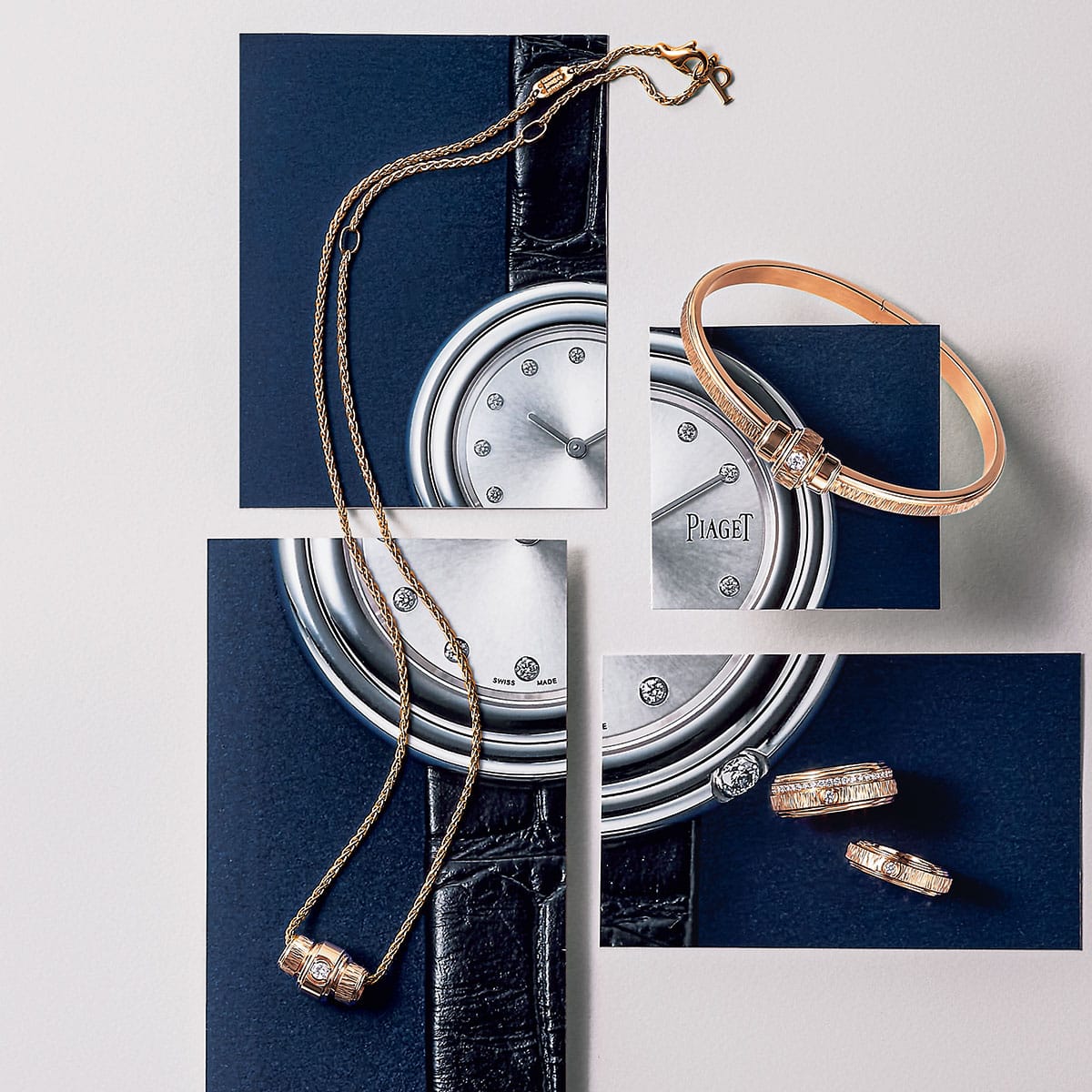 ポセションは、ジュエリーだけじゃなくウォッチも展開。1石のダイヤがくるくる時計の周囲を回る、遊び心と驚きに満ちたデザインです。「常に必要以上にいいものをつくる」というモットーを持つピアジェ、これからもそのクリエイションから目が離せない! 「ポセション」〈PG×D〉バングル¥1,144,000リング上¥932,800下¥327,800ペンダント¥756,800時計〈SS×D×アリゲーターストラップ/ケース34㎜/クォーツ〉¥ 778,800(すべてピアジェ/ピアジェコンタクトセンター)※バングルとリングはサイズによって価格が変わります