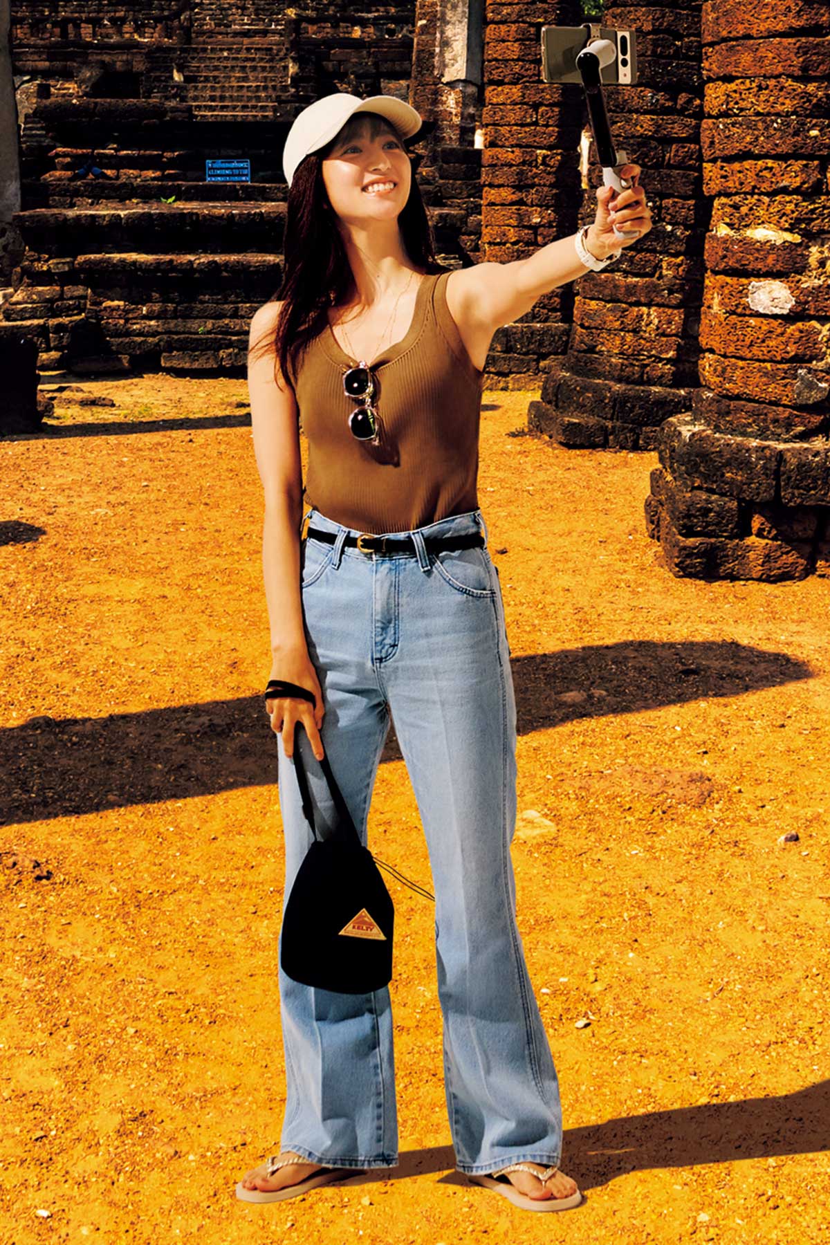 タイ族の最古の王朝の都スコータイへ。雲ひとつない快晴でツイてる!リブタンク×ブルーデニムにキャップでカジュアルに決めて、動画撮影もバッチリ。幸先よいスタート!