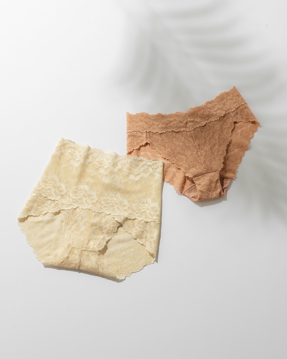 ヌーディカラーなら透けてしまう心配は無用。総レースのショーツを選べば、着ていて気分も上がる!〈右〉肌色に近いカラー&凹凸の少ないレースで透け感を防ぐ。〈左下〉ゴム不使用でチクチク感も軽減してくれる優れもの。繊細なレースだからボトムスに響きにくいのが特徴です。