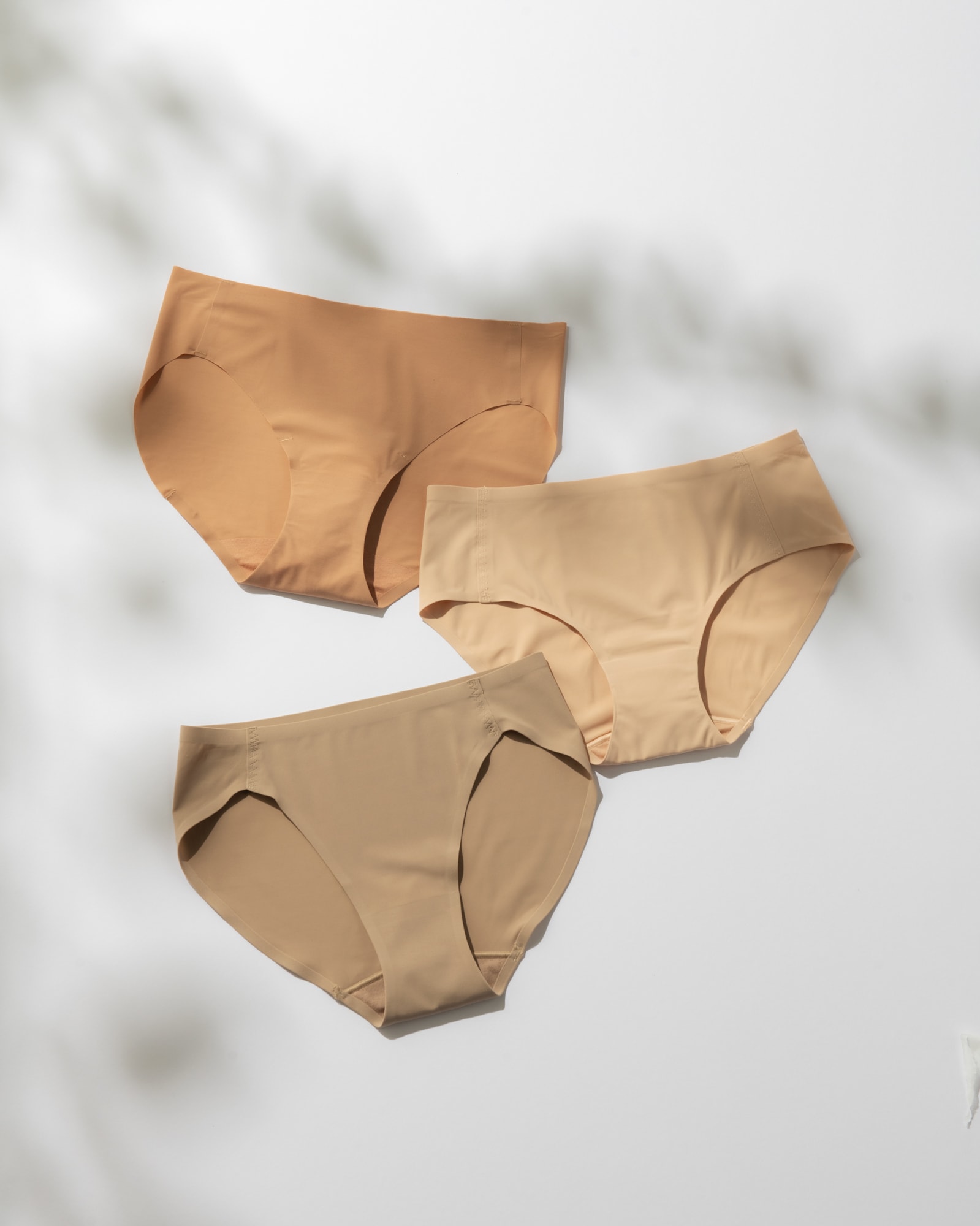 薄手素材&切りっぱなしの超シームレスなデザインならどんなボトムスにも響かない! クロッチ部分はしっかり二重になった安心感があるものをセレクトして。〈上〉サイドのはぎ目とクロッチ部は接着仕様。極力縫製を減らし、肌と一体化するデザイン。〈中〉高品質な素材を利用したシームレスショーツ。ローライズでどんなボトムスにも対応!〈下〉やや浅めの穿き込み丈で足さばきのよさと脚長効果を兼ね備えたデザイン。