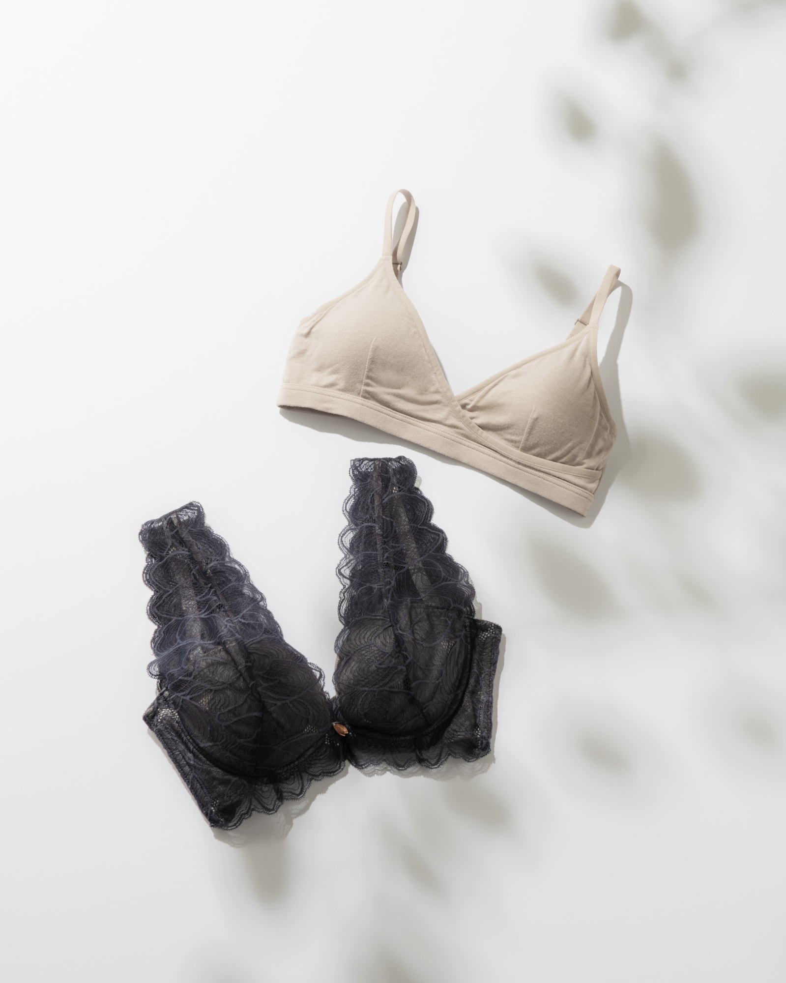 〈上〉左右がクロスしたカップ部分のデザインが可愛い♡ トップスに響きにくいブラ選びのコツは、カップとストラップの境目がないものを選ぶこと! 〈下〉レースがカップとストラップを包み込むドラマティックなデザイン。付けていて気分が上がるデザイン性とホールド力、透けにくさを一挙に解決!