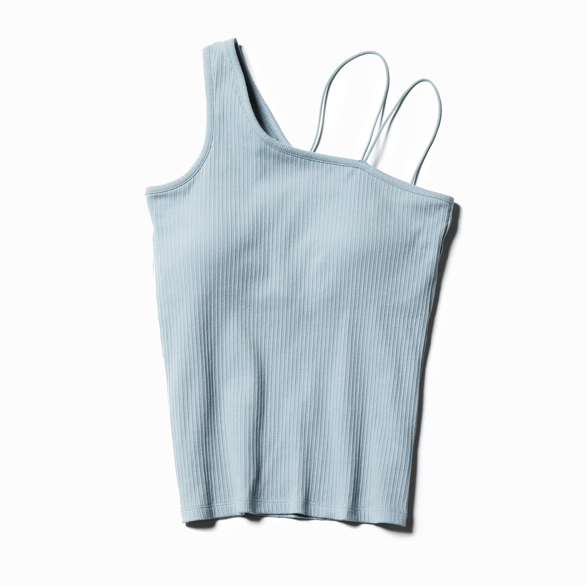 ホワイトの透け感シャツのインナーには爽やかなアイスブルーを選んで涼やかに。ワンショルダーと華奢なストラップを組み合わせたアシンメトリーなデザインで、ほんのりモード感を漂わせると◎。カップ付きだから1枚で着られて、見えてもOKのオシャレさがうれしい! 体にフィットするタイトなサイズ感が女性らしさも演出してくれます。