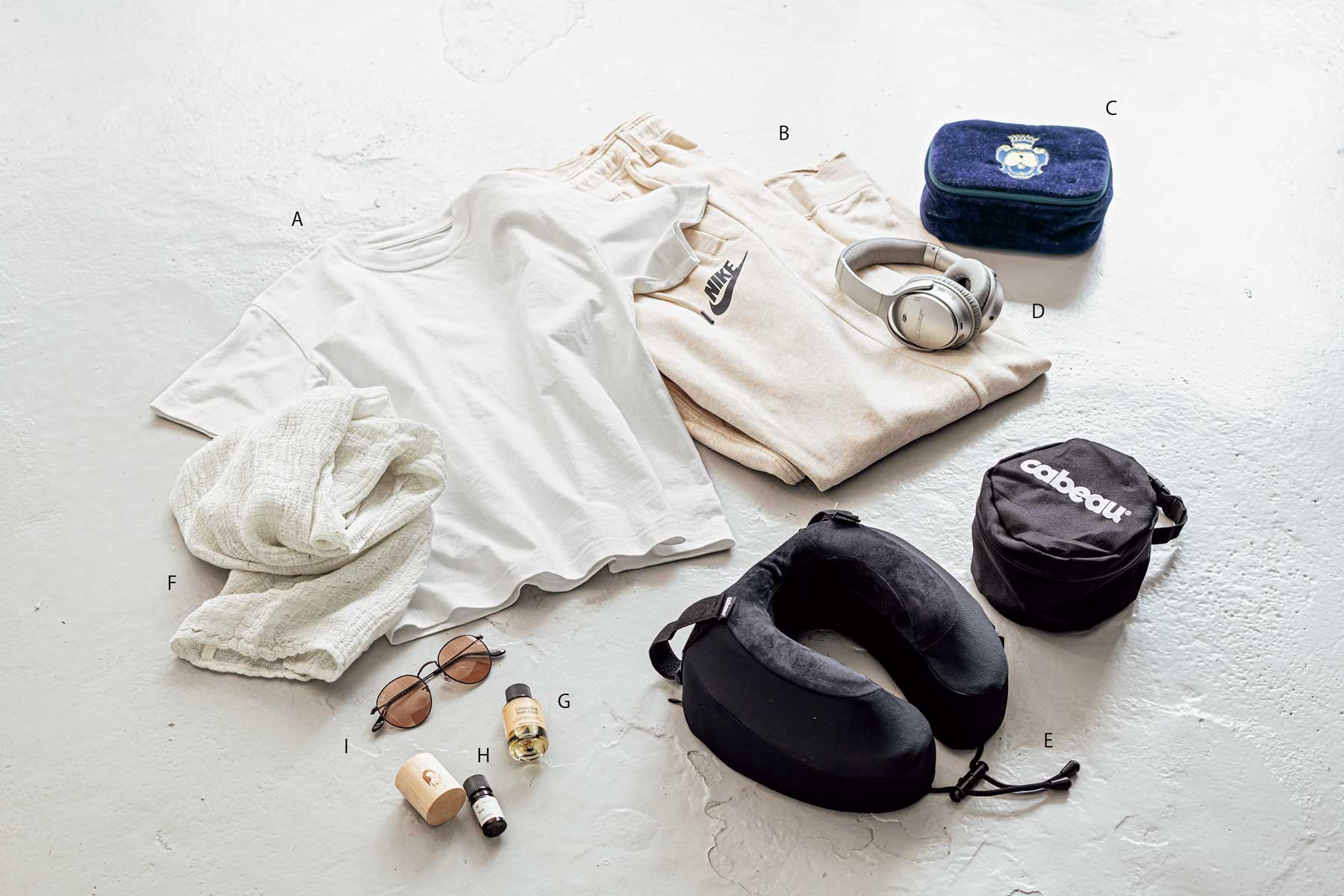 A.メンズっぽいシルエットが気に入っている「Hanes」の白TはXSとLなど、サイズ違いで数枚持って行きます。購入しやすい価格なので、汚れてしまってもショックが少ないのもポイントです。B.NIKEとLevi’s®を融合させたアップサイクルのパンツはセレクトショップで見つけた「bless」のもの。機内着はリラックスできて、かつだらしなく見えないものを選んでいます。C.イタリアで購入した「サンタ・マリア・ノヴェッラ」のポーチ。クッション性があるので、アロマの瓶や化粧品を入れています。D.「BOSE」のヘッドフォンはノイズキャンセリング機能が優れているので、機内の騒音をシャットアウトして眠りたい時に重宝しています。E.使い心地抜群な「Cabeau」のネックピローは、座席のヘッド部分に紐で固定できるので、長時間座った姿勢で眠っても首が痛くなりません。コンパクトに収納できるのも最高!F.「LAPUAN KANKURIT」のタオル。枕に敷いたり、ブランケット代わりにしたりと万能。G.「PALM of FERONIA」のアロマオイル。ホテルの部屋に好みの香りを漂わせると心地よさがグンとアップします。H.木の置物に液体を垂らして使う「yes.」のアロマディフューザー。気持ちをスッキリさせてくれる香りが好みです。I.海外は日本よりも日差しが強い地域もあるので、「Ray-Ban」のサングラスが必須。