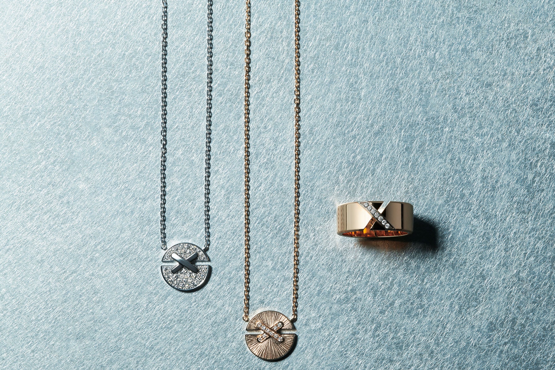 中央のエレメントがふたつの運命を繋ぐ───直線と曲線が織りなす普遍的なデザイン。ユニセックスな佇まいは、アイテムを変えてのペア使いや重ね付けなどミックス&マッチも思いのまま。