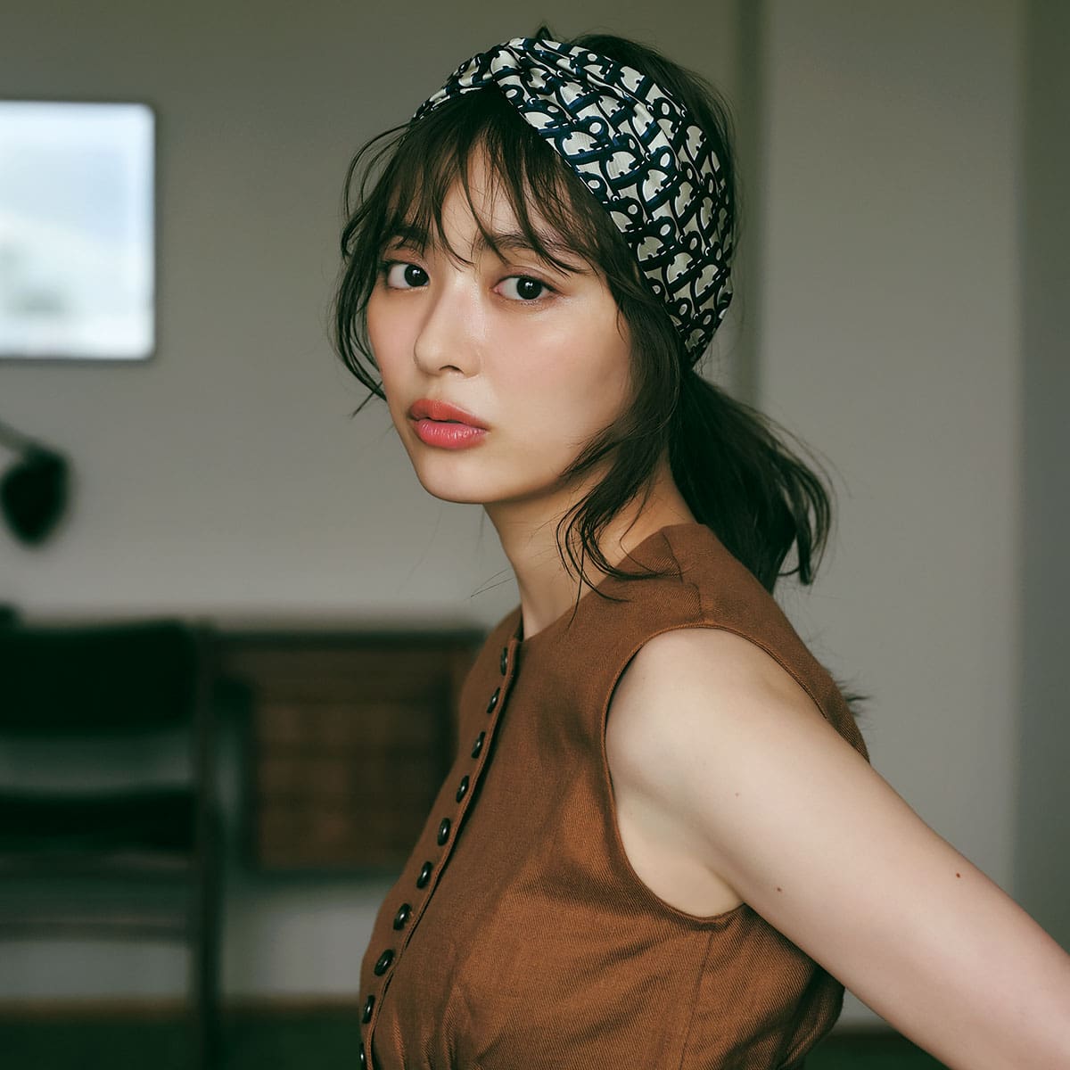 無造作にまとめたヘアの仕上げにディオールのバンドが上級者っぽいでしょ?